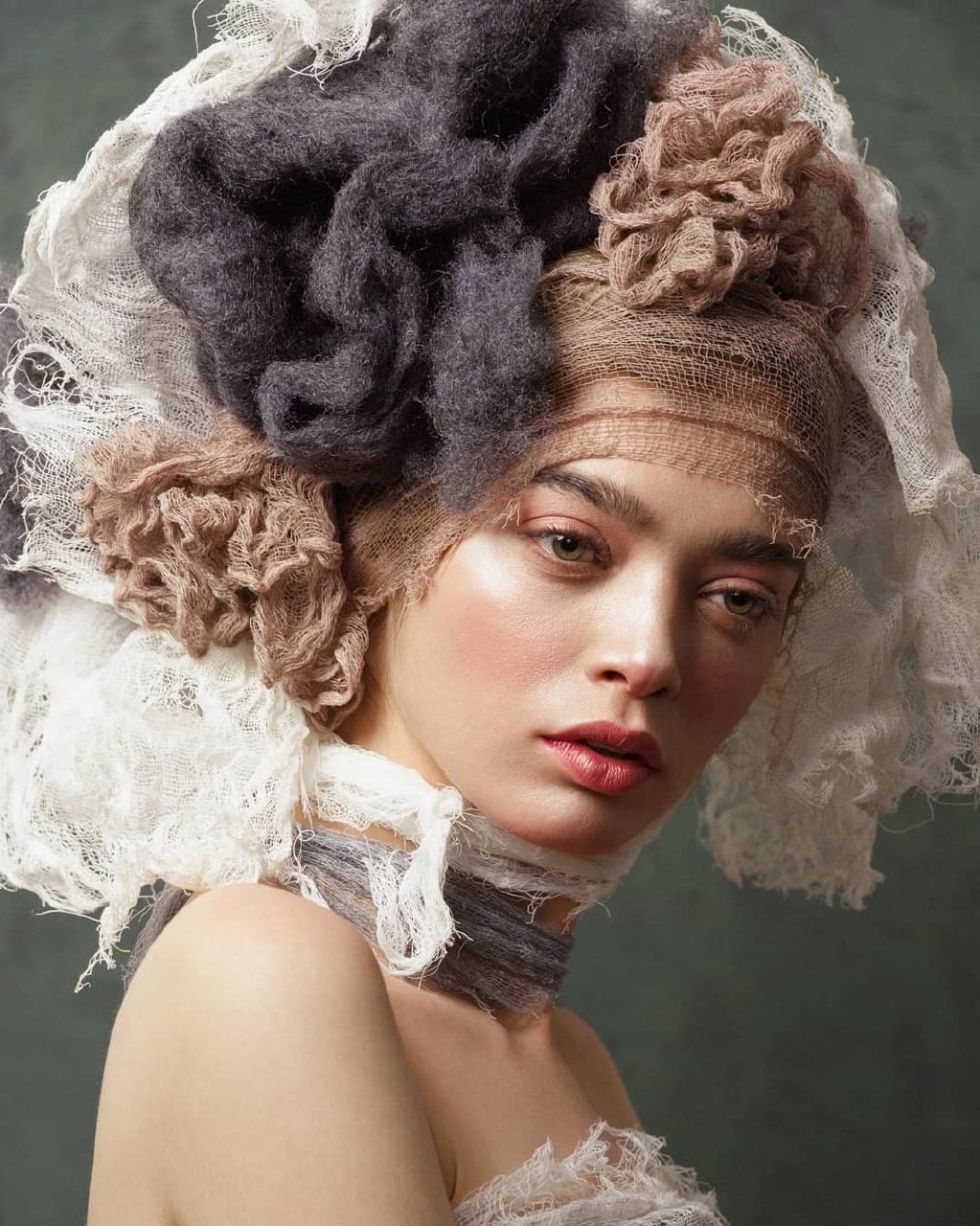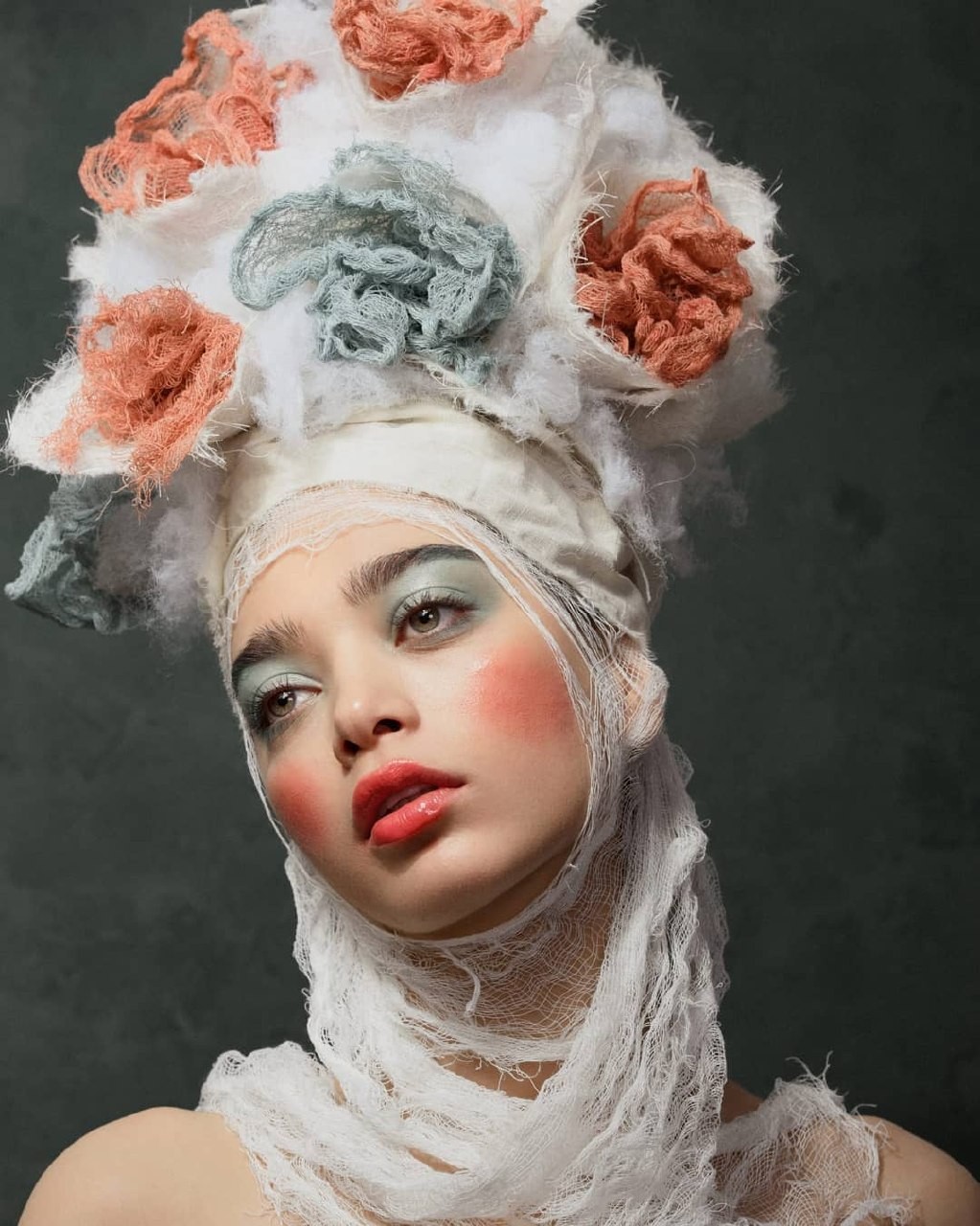 In Doran, this material sensibility deepened. Fabrics that had already lived were reintroduced into the process. Handwoven textiles, natural dyes, textures that are not only visible but tangible. Here, forms began to diverge, some moving closer to the head, others distancing themselves, extending upward.