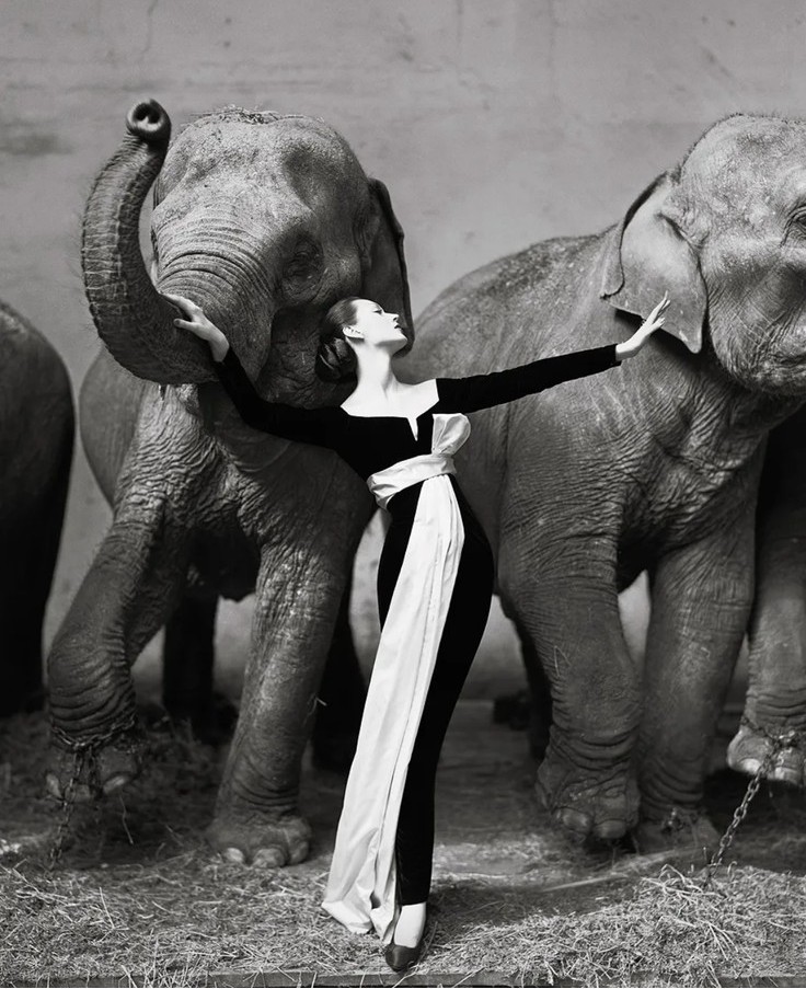 His famous photograph “Dovima with Elephants” (1955) remains one of the most iconic images in fashion history. The contrast between the refined Dior gown and the massive circus elephants created a striking visual tension. It was theatrical, dramatic, and unforgettable.
