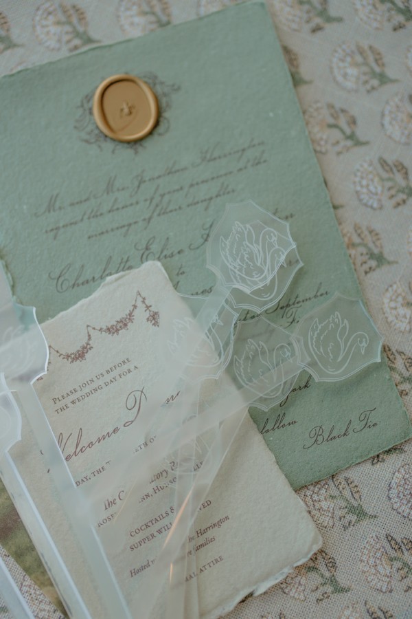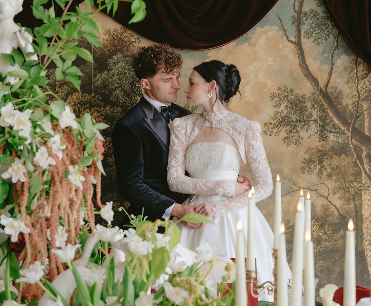 Even the smaller details, tartan tablecloth referencing English heritage, velvet table numbers, fruit accents, and wax-seal stationery, serve to enrich the narrative. The effect is consistent: every visual element contributes to an overall sense of elevated romance.