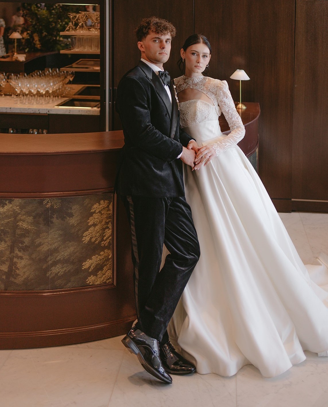 In this editorial, fashion does not simply complement the setting, it tells the story. The groom’s attire echoes the decor and vertical aesthetic of the high-rise environment, while the bride’s styling embodies the central fairy-tale metaphor. Rich velvet, satin, and layered brooches work as visual tools that merge classic elegance with modern editorial sophistication.