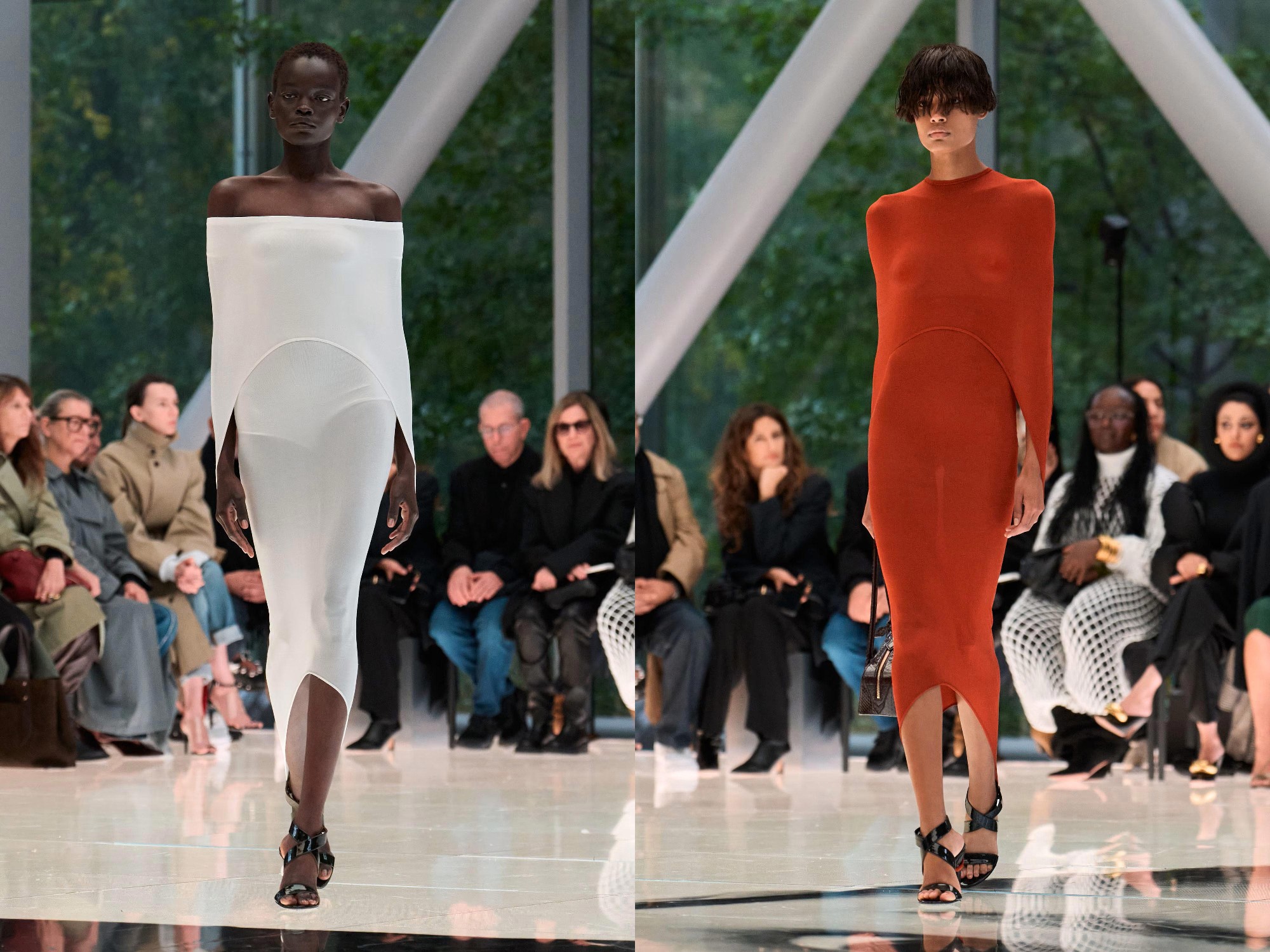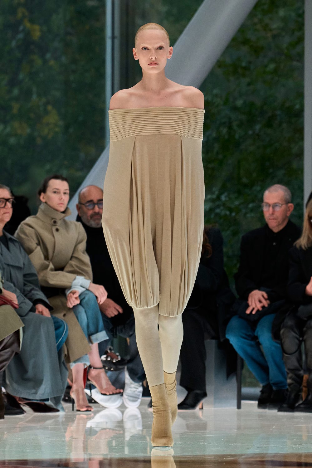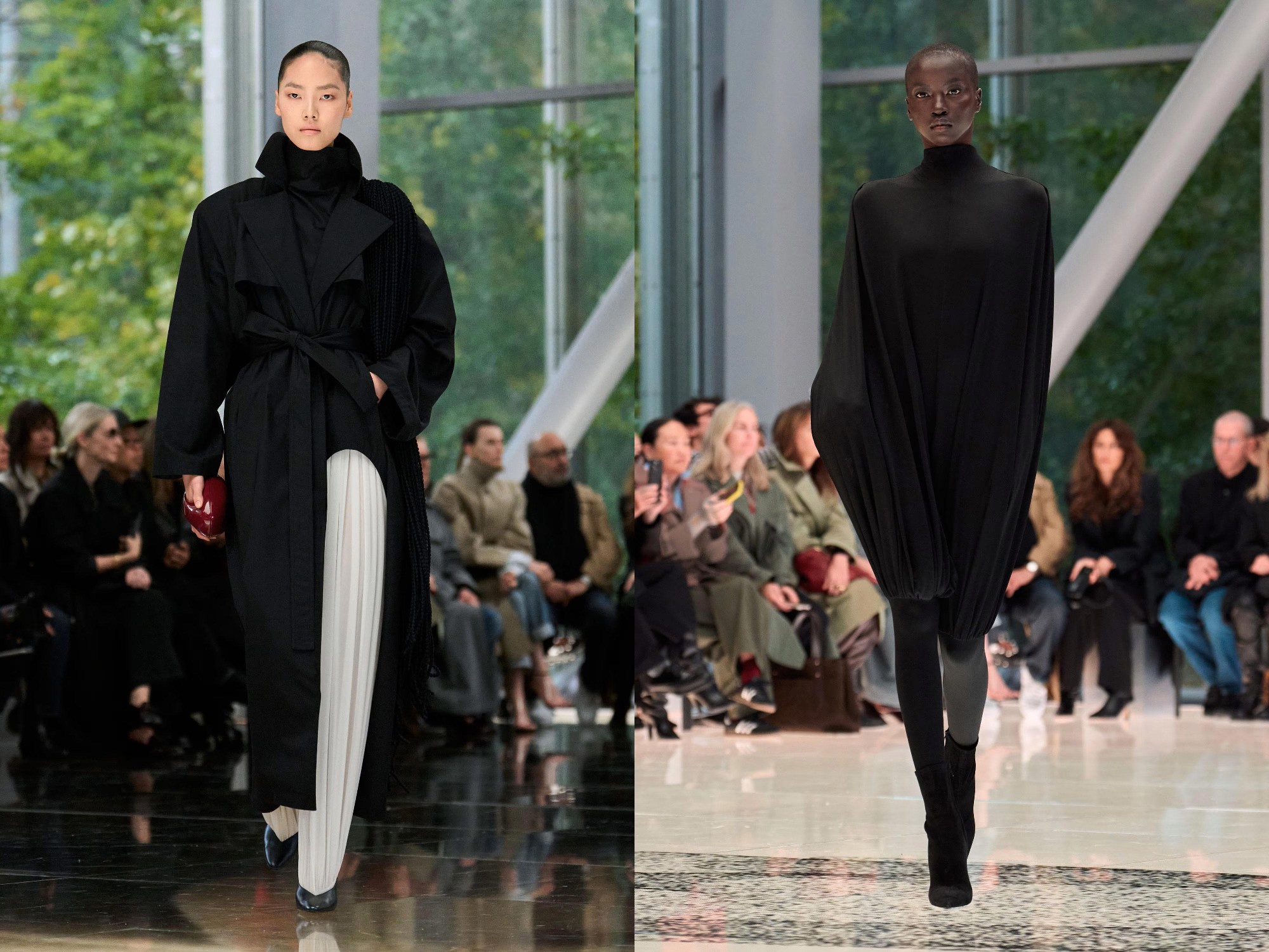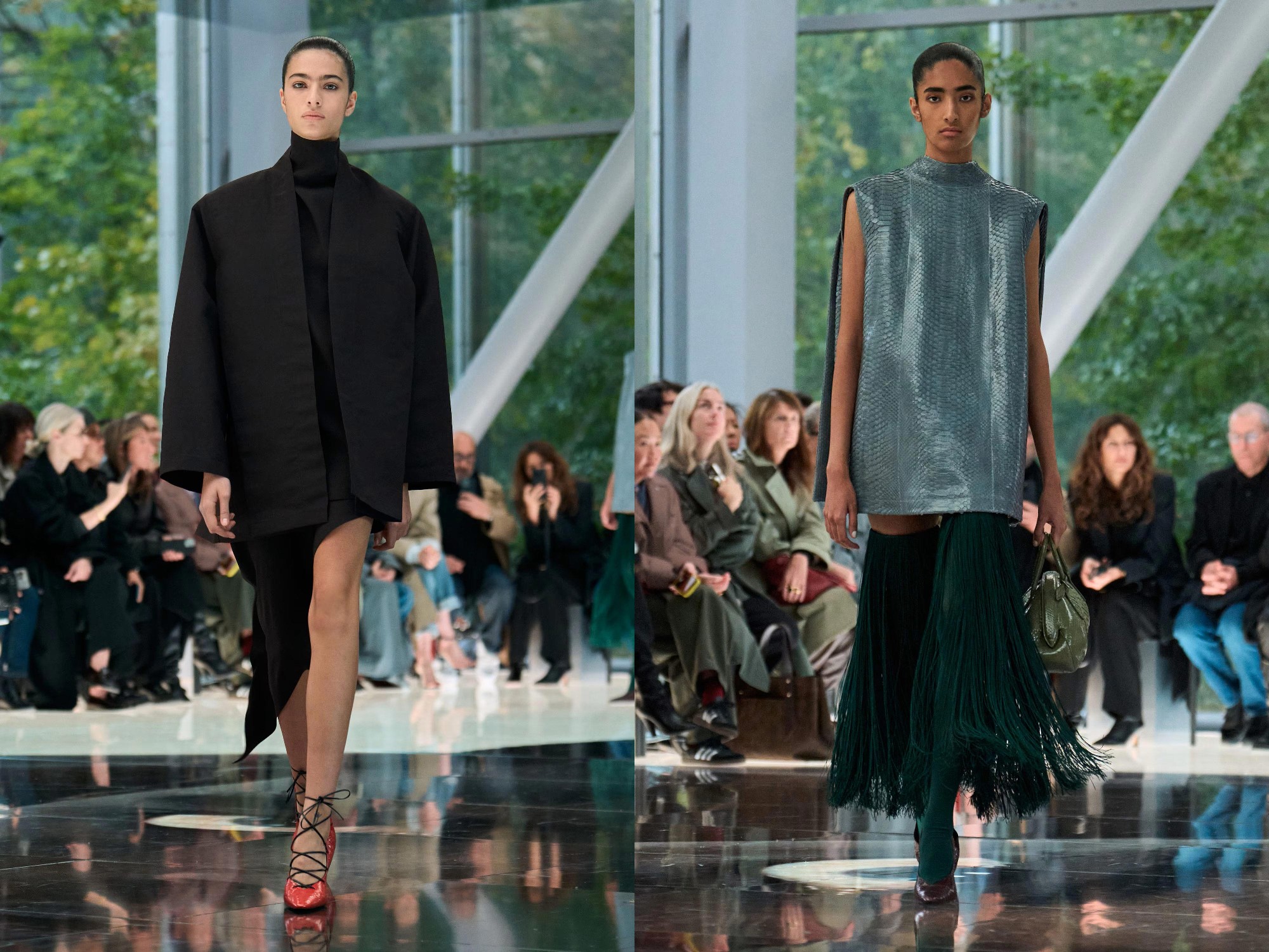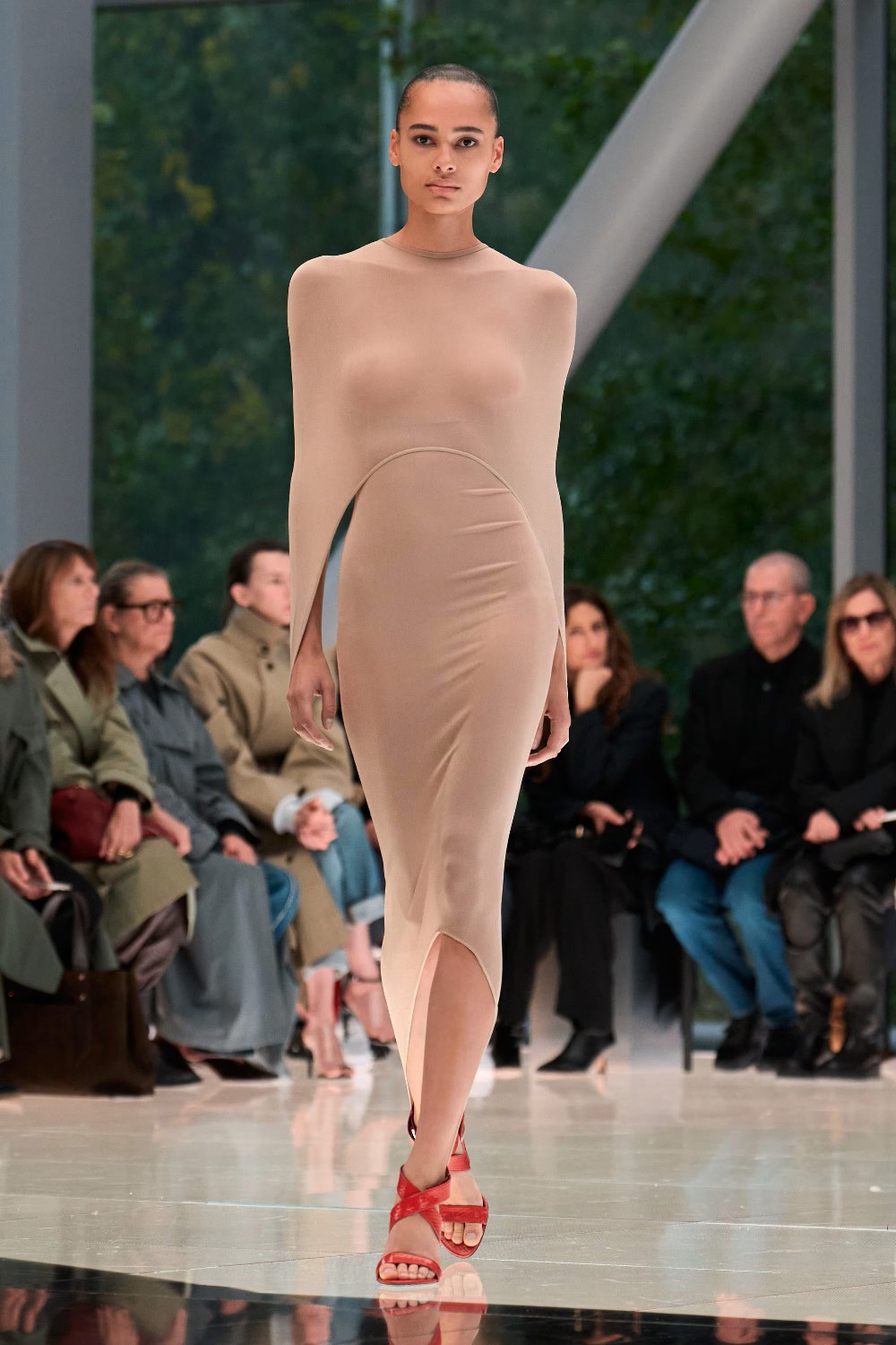 Workwear codes are elevated into couture, inspired by the notion of a pragmatic uniform charged with sensual undercurrents. Boxy jackets with raised collars nearly brush the lips; gathered jersey trousers slip into sleek leather heels; minimal surfaces evoke opulence without excess. The casting, featuring guests such as Kim Kardashian and Cynthia Erivo, reinforced the house’s cultural relevance while underscoring its human scale.