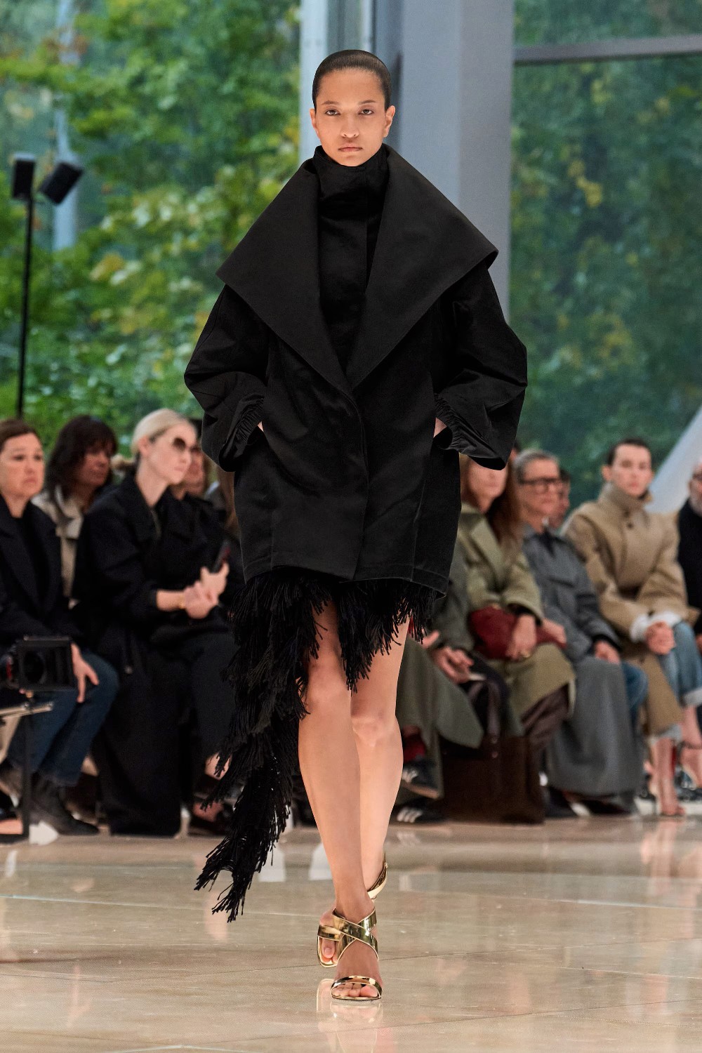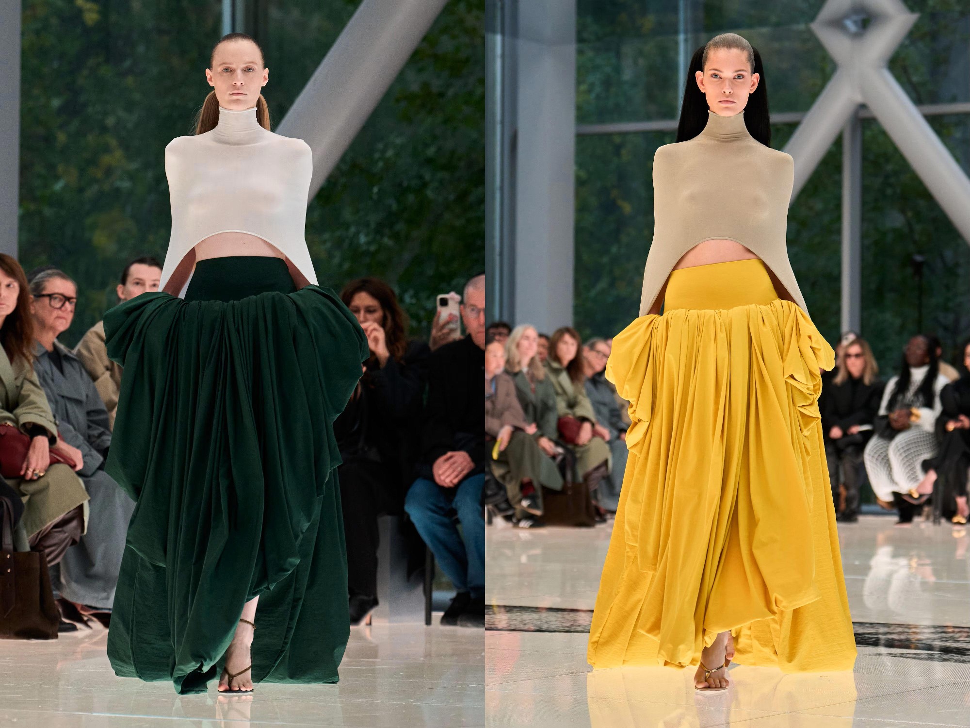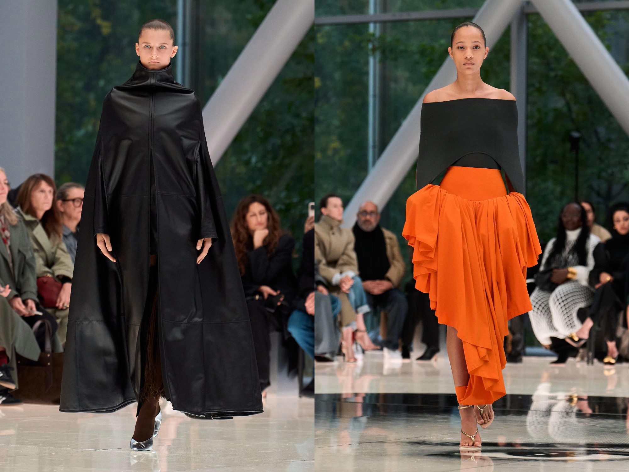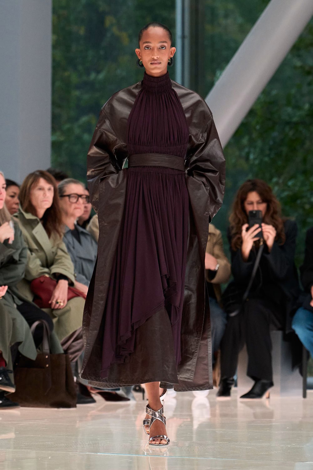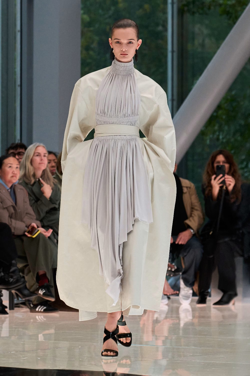 Workwear codes are elevated into couture, inspired by the notion of a pragmatic uniform charged with sensual undercurrents. Boxy jackets with raised collars nearly brush the lips; gathered jersey trousers slip into sleek leather heels; minimal surfaces evoke opulence without excess. The casting, featuring guests such as Kim Kardashian and Cynthia Erivo, reinforced the house’s cultural relevance while underscoring its human scale.