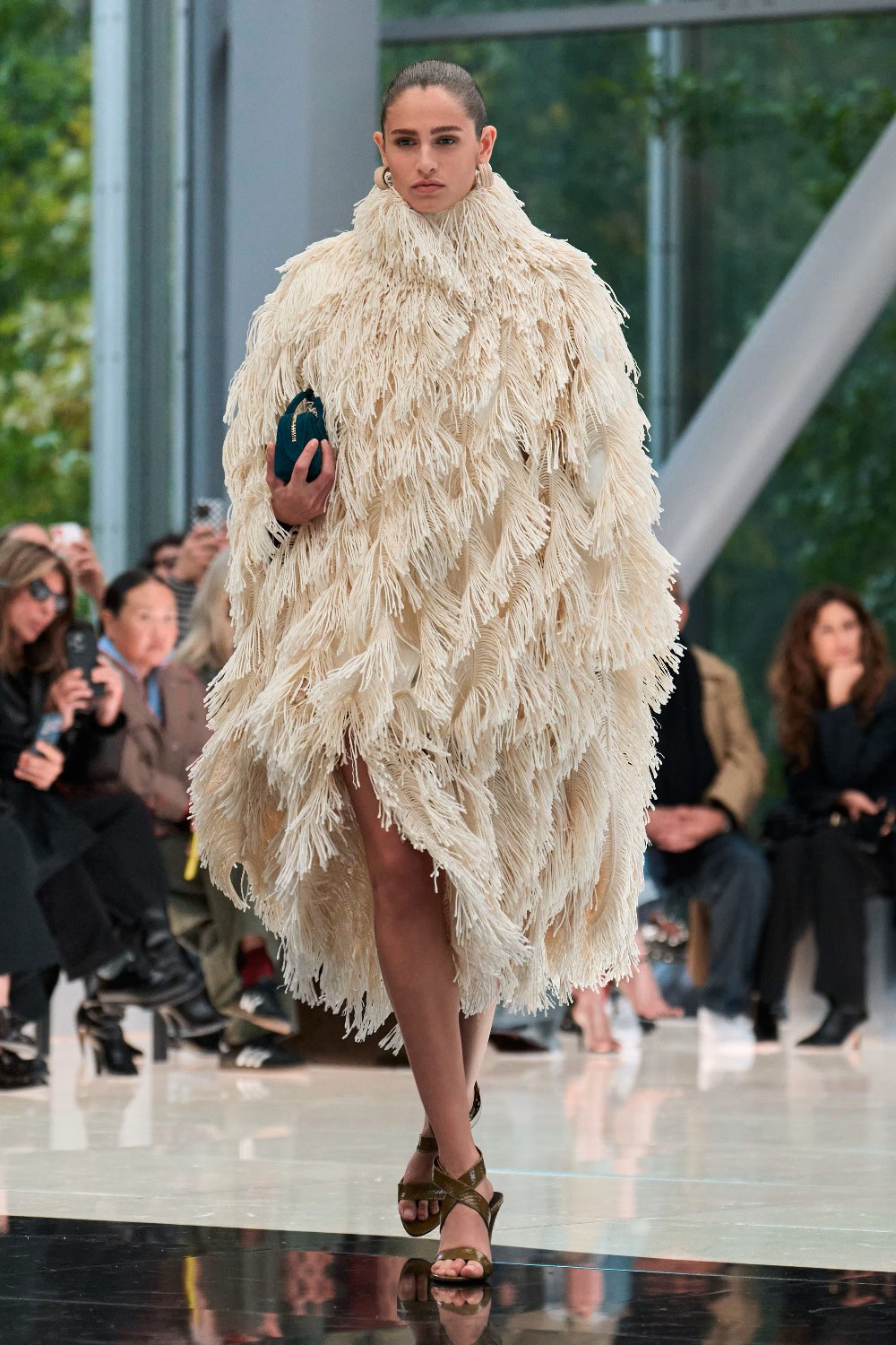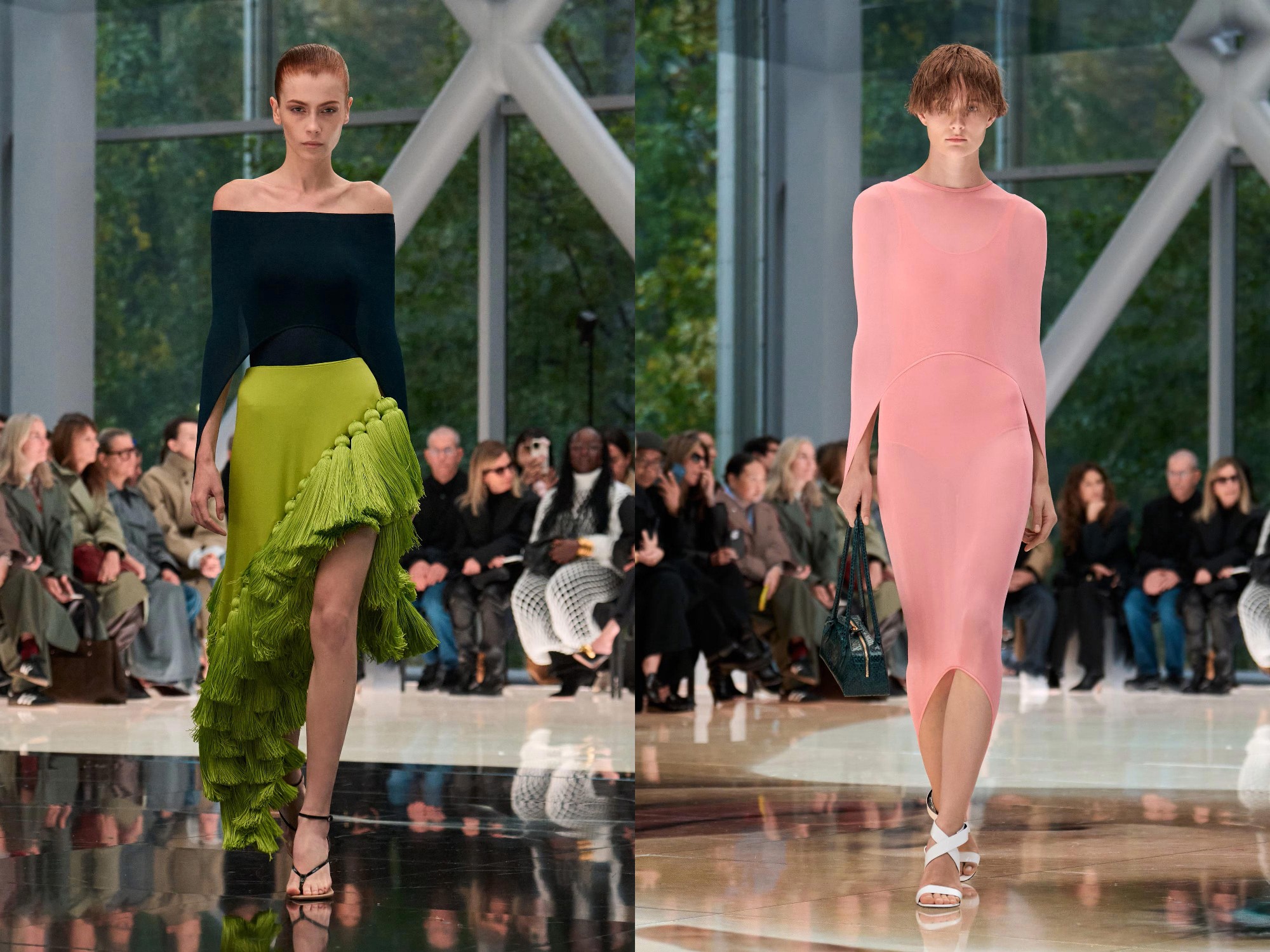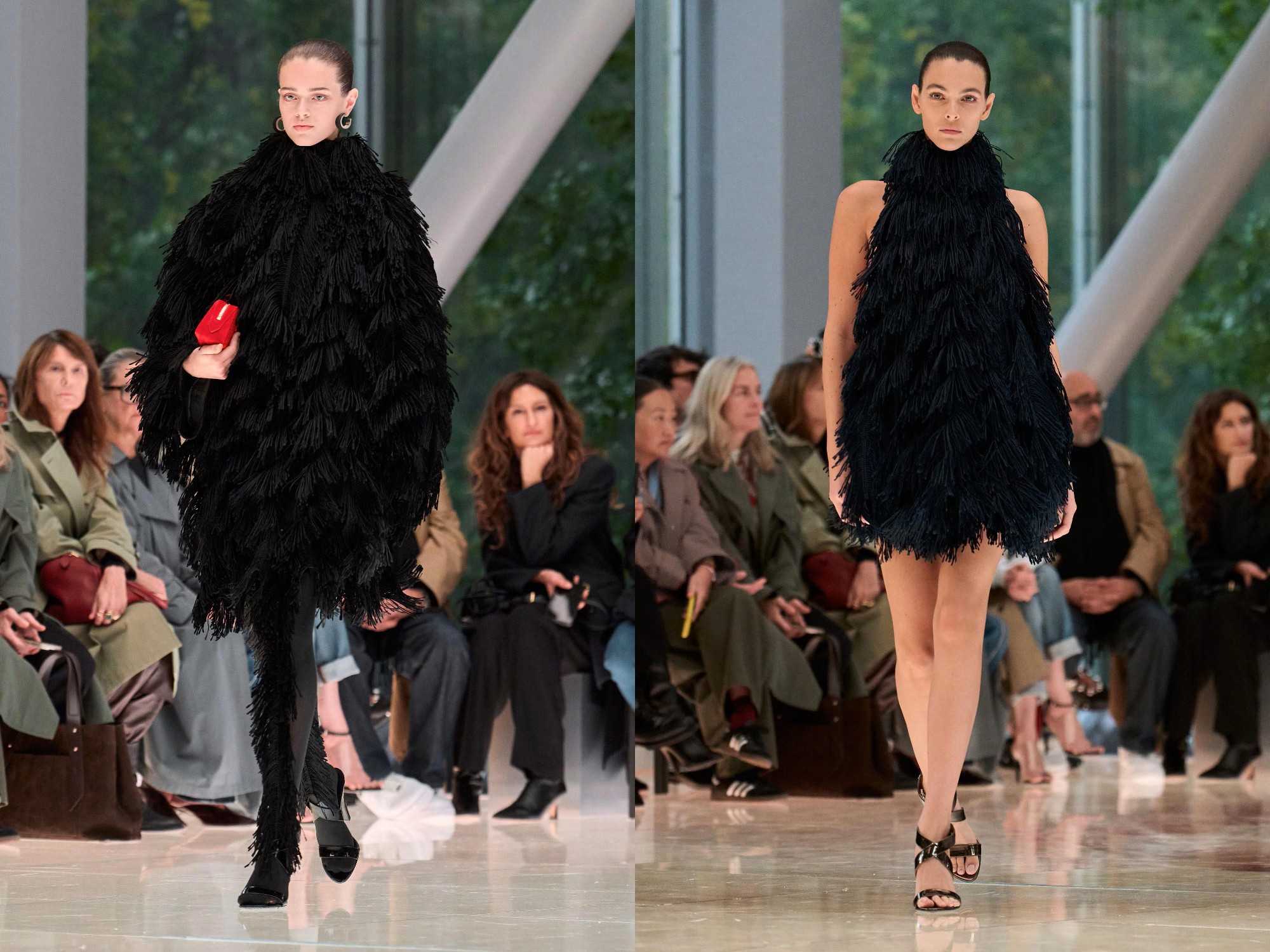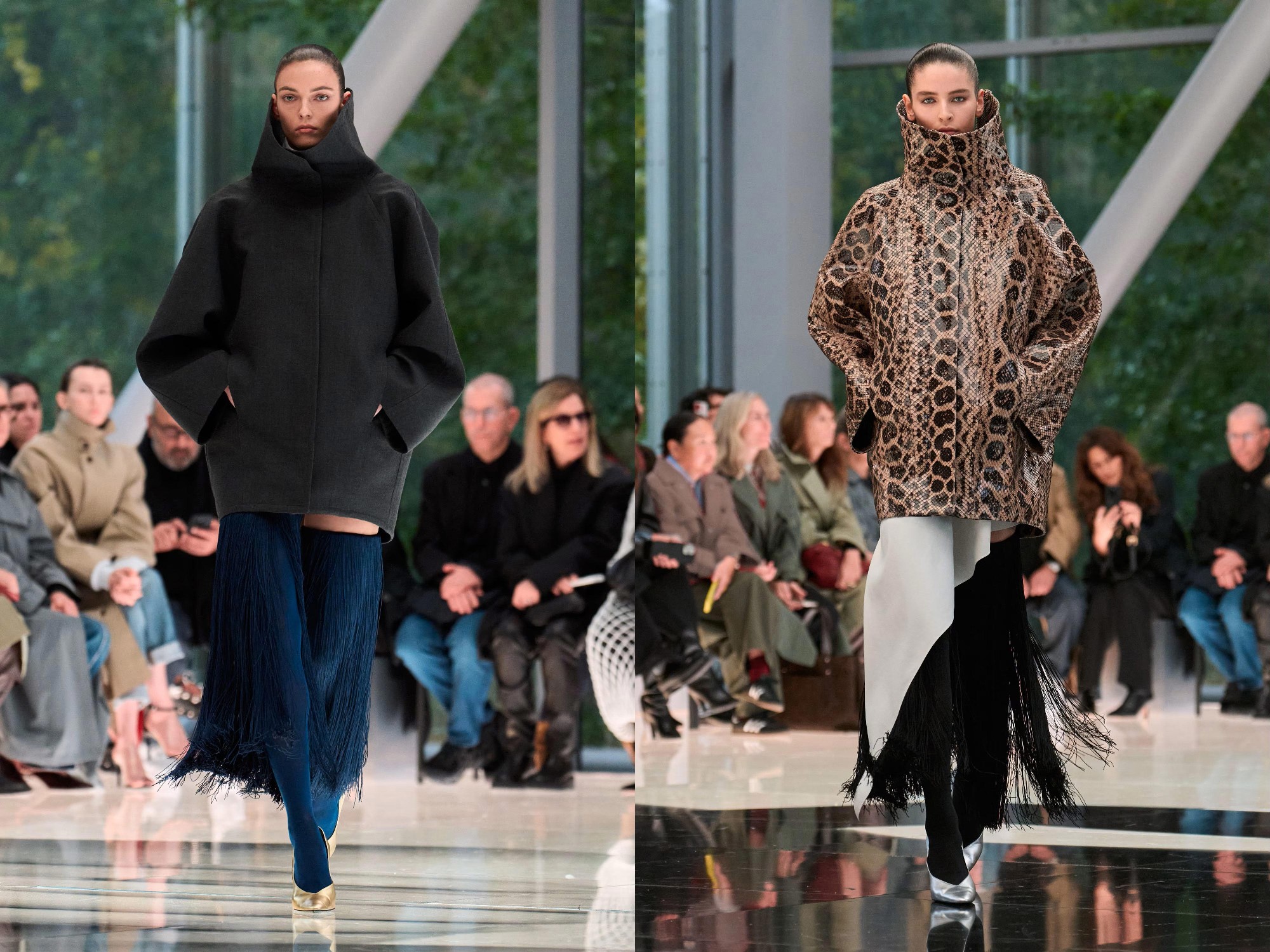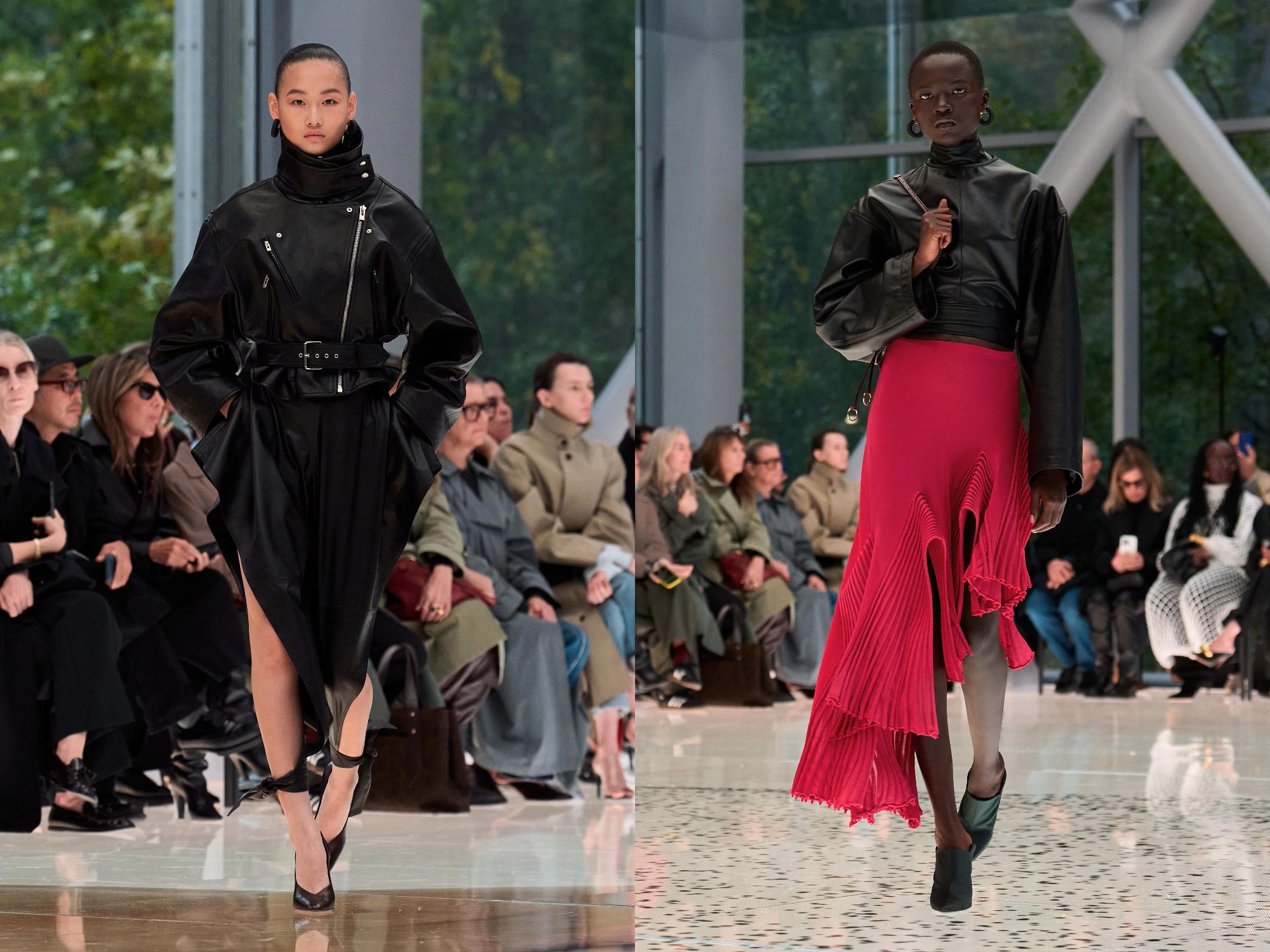 Workwear codes are elevated into couture, inspired by the notion of a pragmatic uniform charged with sensual undercurrents. Boxy jackets with raised collars nearly brush the lips; gathered jersey trousers slip into sleek leather heels; minimal surfaces evoke opulence without excess. The casting, featuring guests such as Kim Kardashian and Cynthia Erivo, reinforced the house’s cultural relevance while underscoring its human scale.