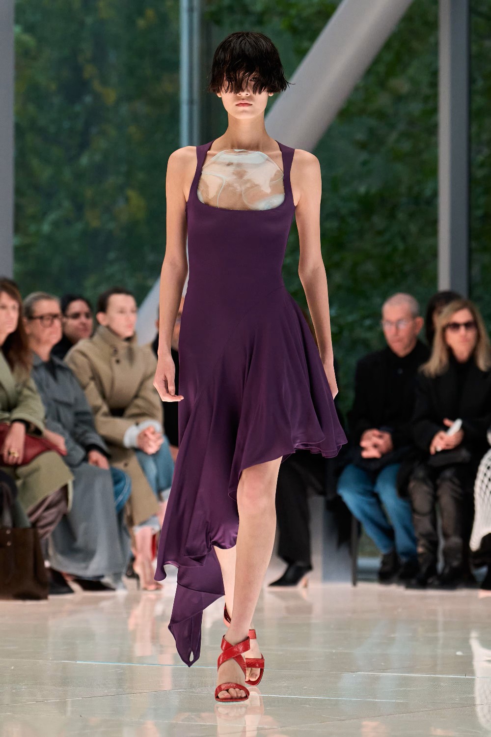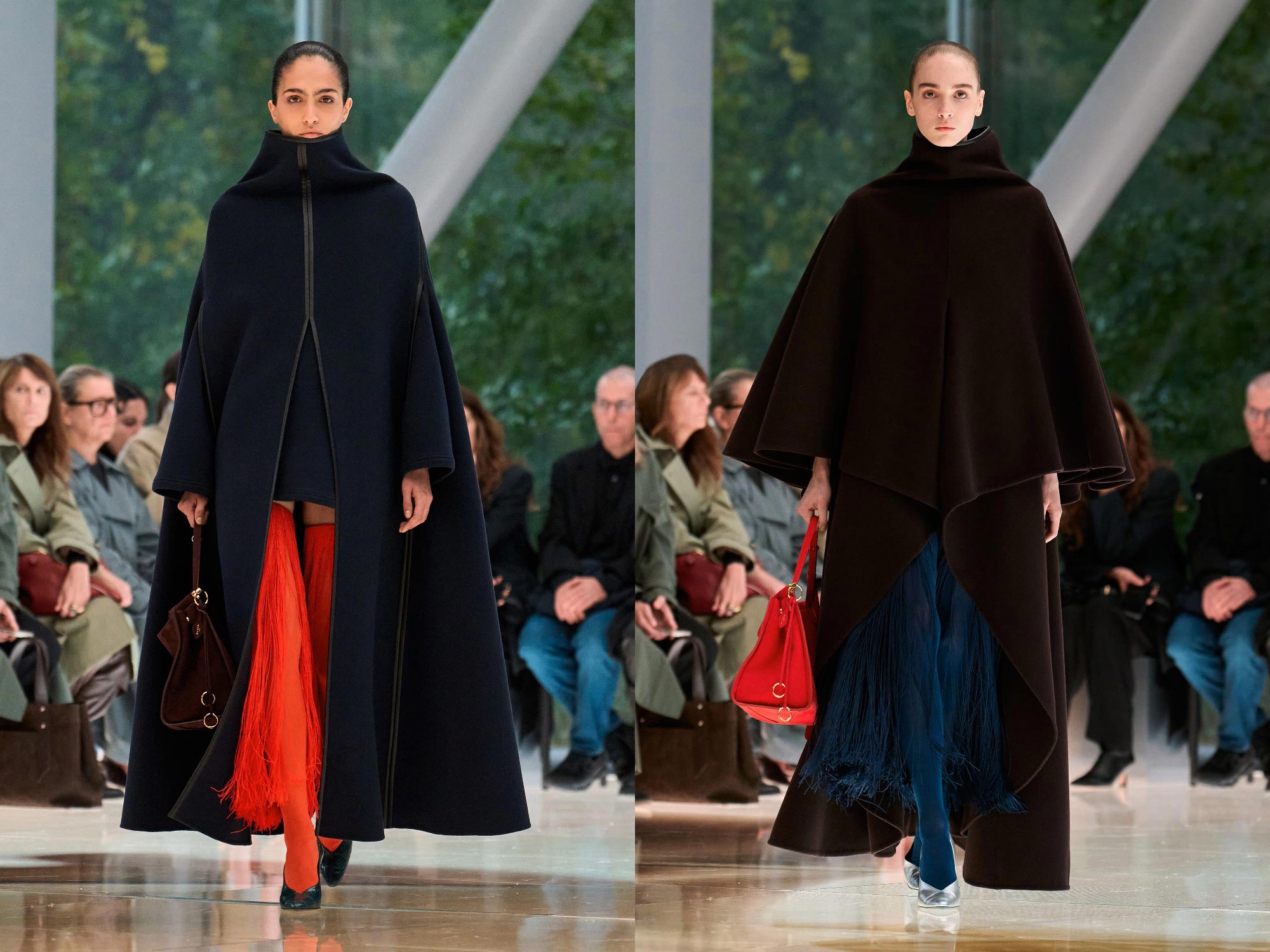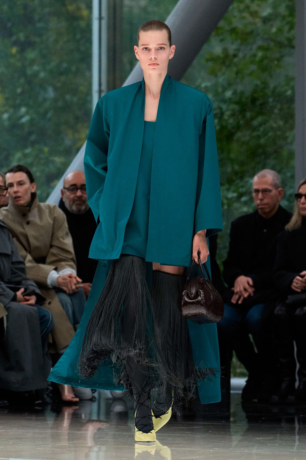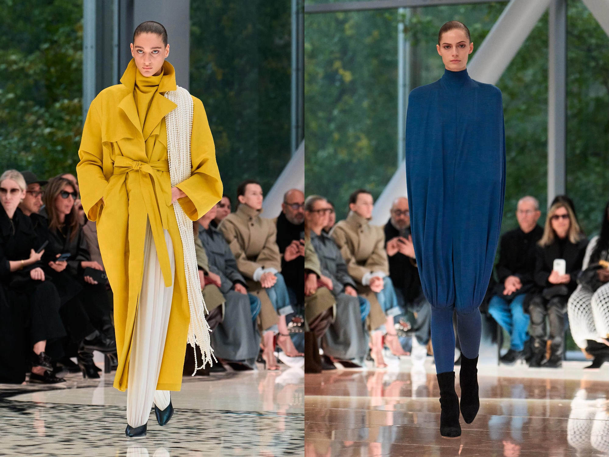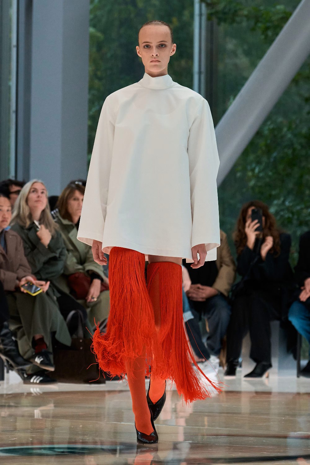 Workwear codes are elevated into couture, inspired by the notion of a pragmatic uniform charged with sensual undercurrents. Boxy jackets with raised collars nearly brush the lips; gathered jersey trousers slip into sleek leather heels; minimal surfaces evoke opulence without excess. The casting, featuring guests such as Kim Kardashian and Cynthia Erivo, reinforced the house’s cultural relevance while underscoring its human scale.