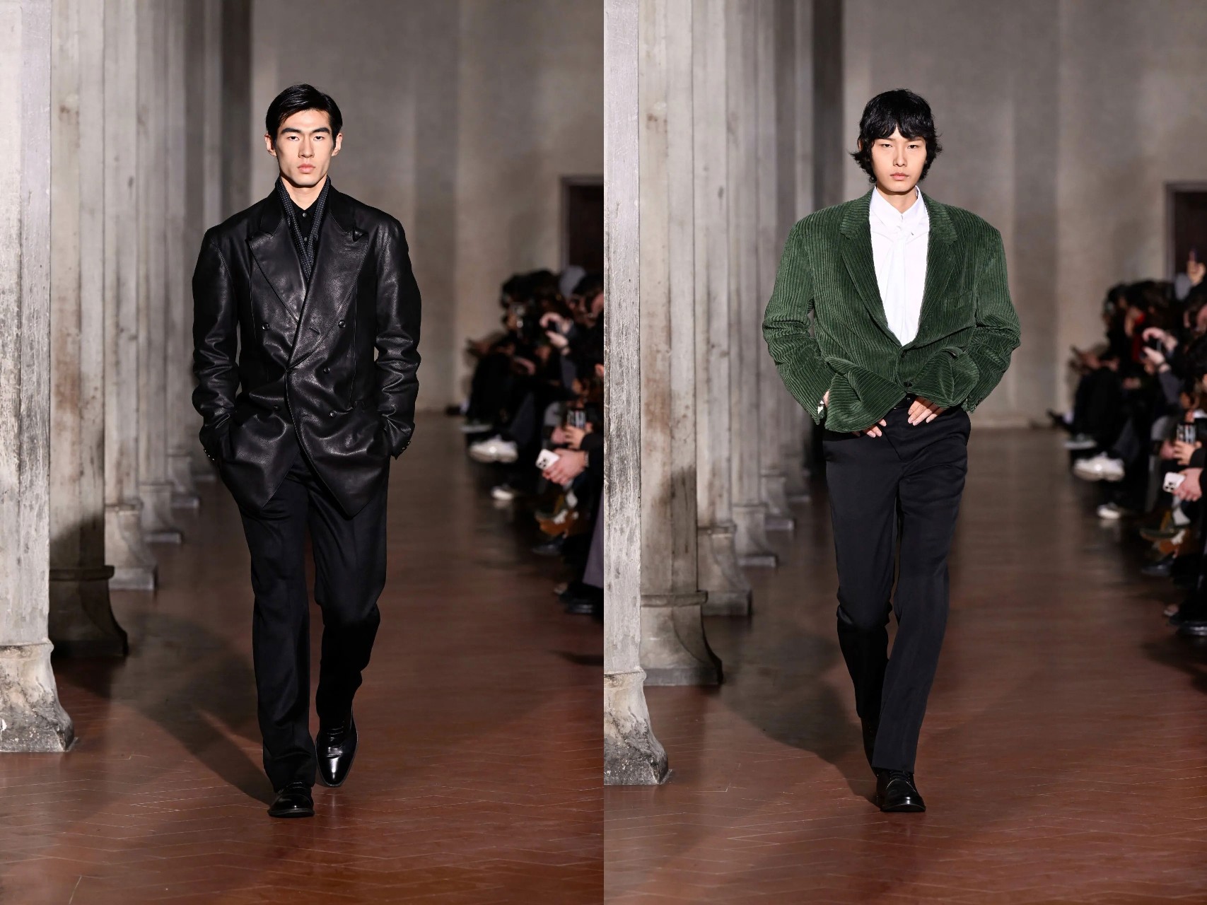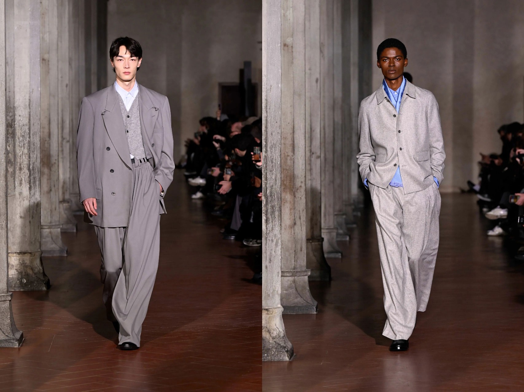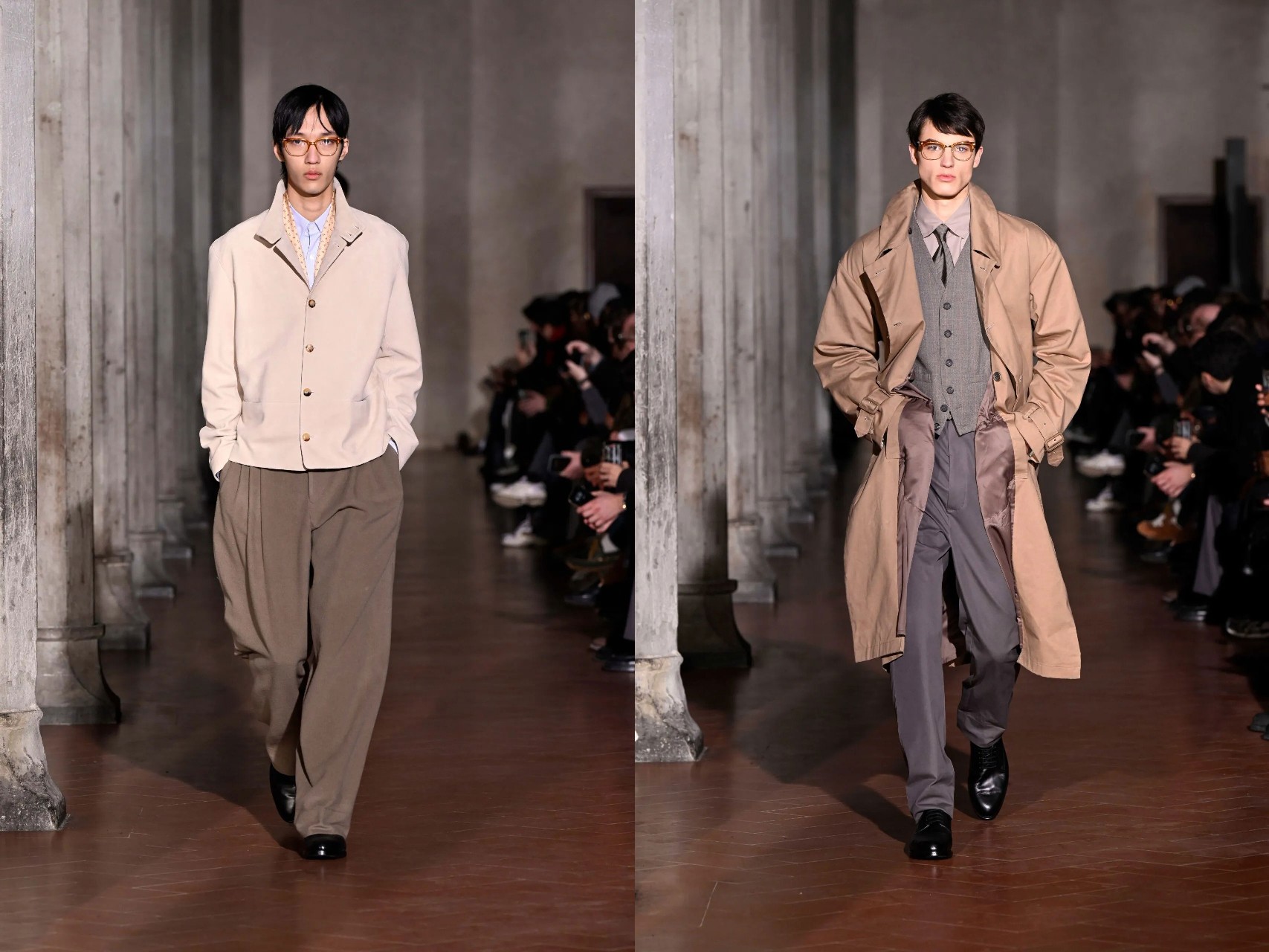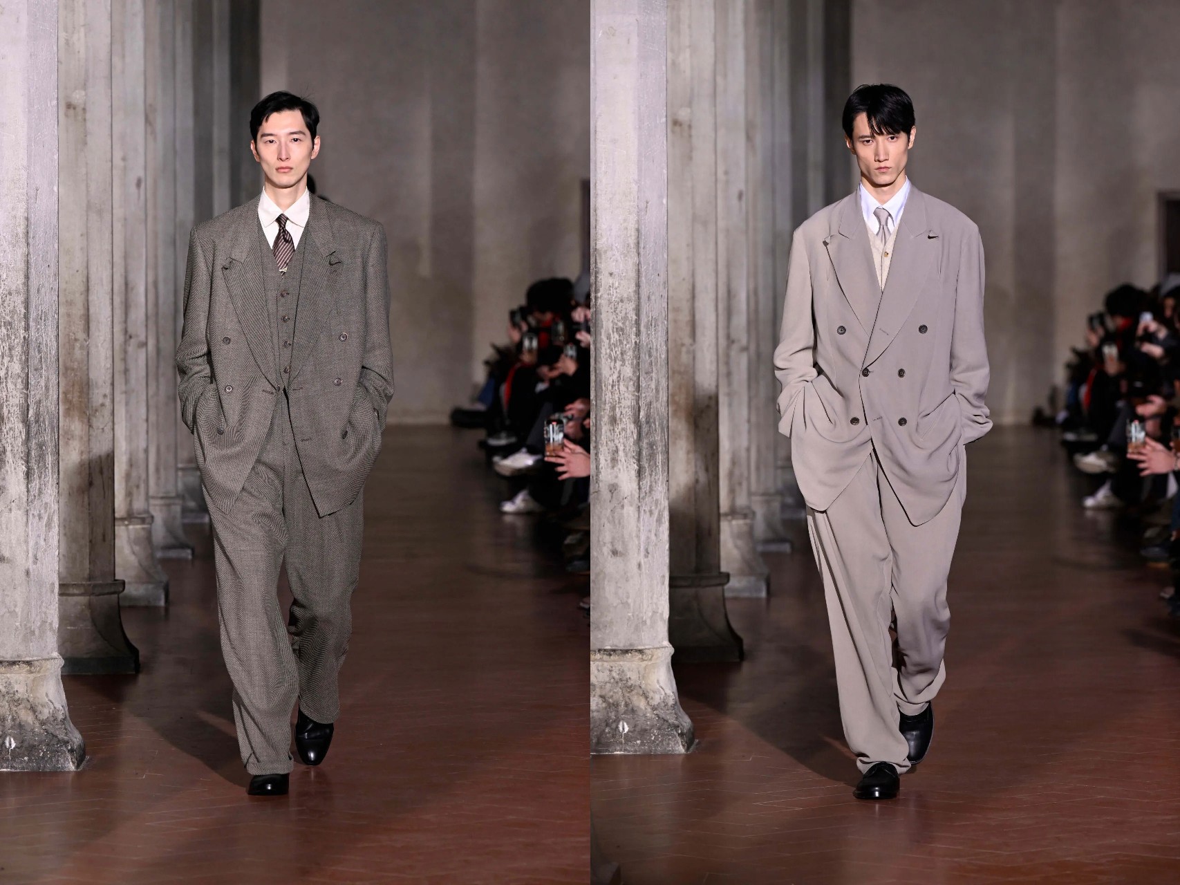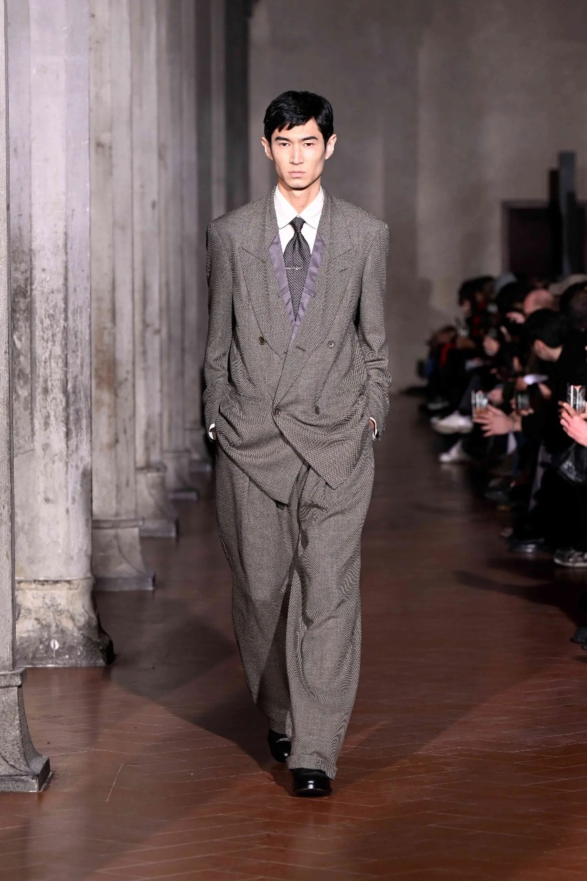 Staged inside the vaulted Refettorio of Santa Maria Novella, the Fall presentation unfolded like a dialogue between eras and geographies. Otsuki’s tailoring, fluid, elongated, and subtly deconstructed, carried the unmistakable echo of Giorgio Armani, long cited by the designer as a personal hero. Yet this was not homage; it was translation.
