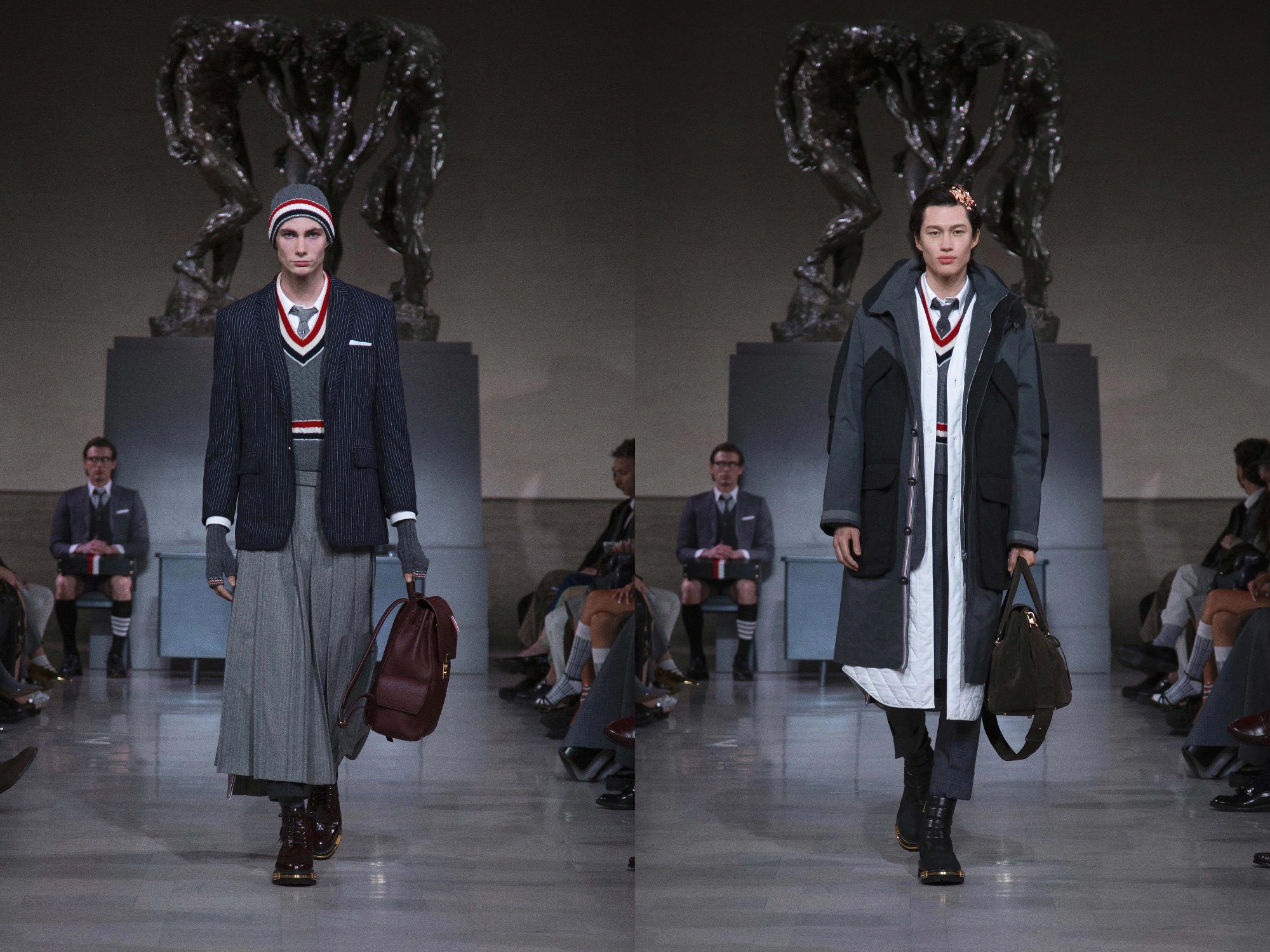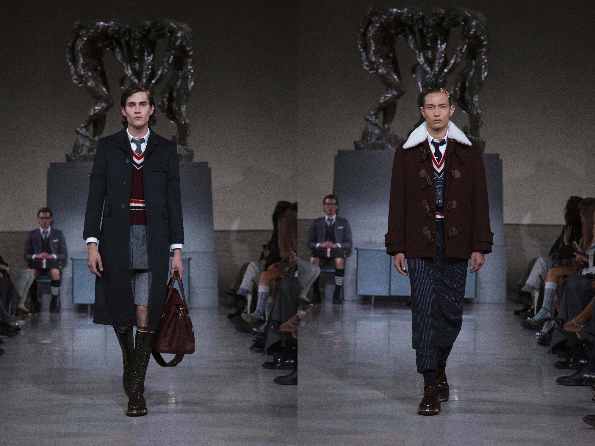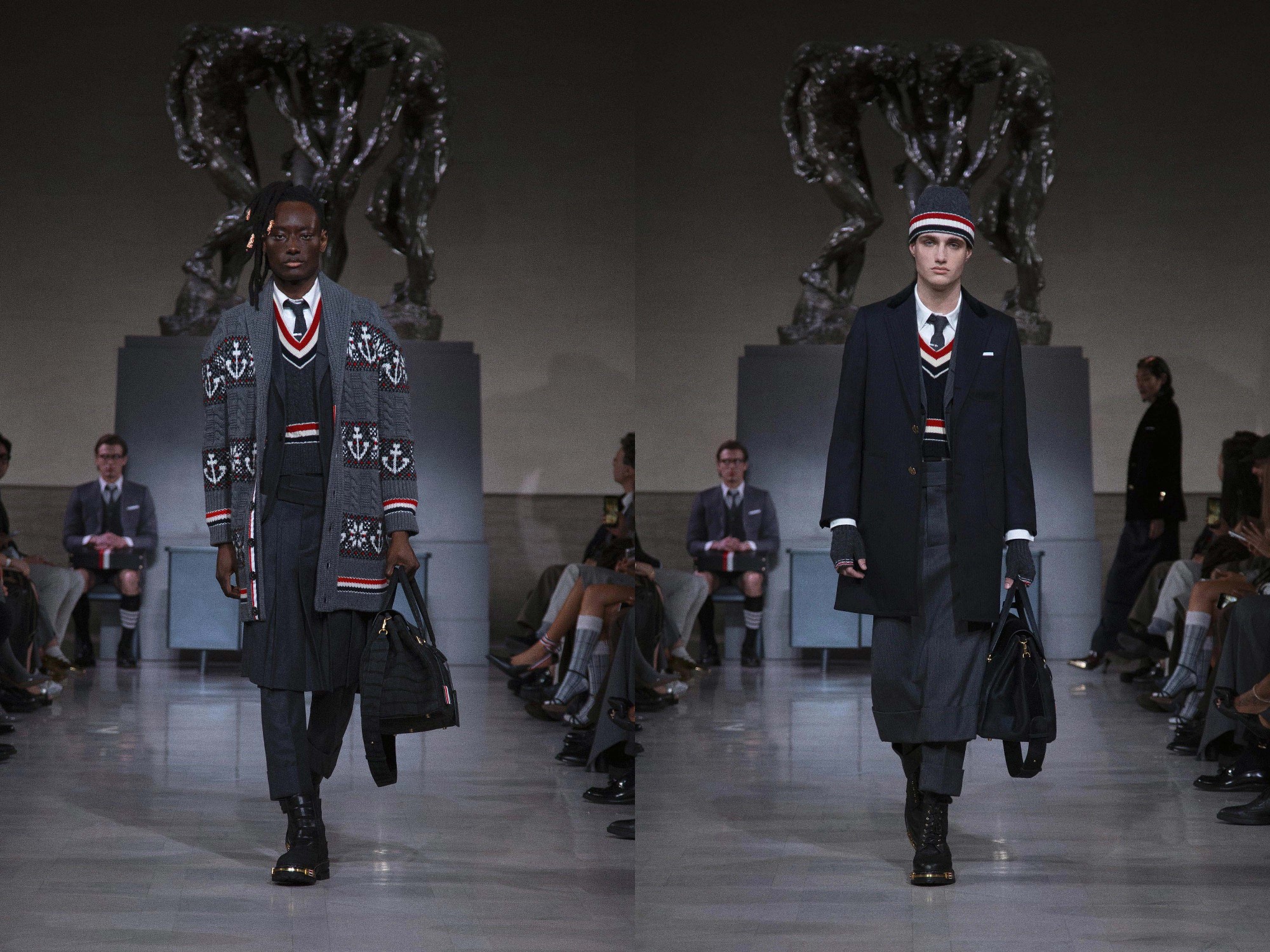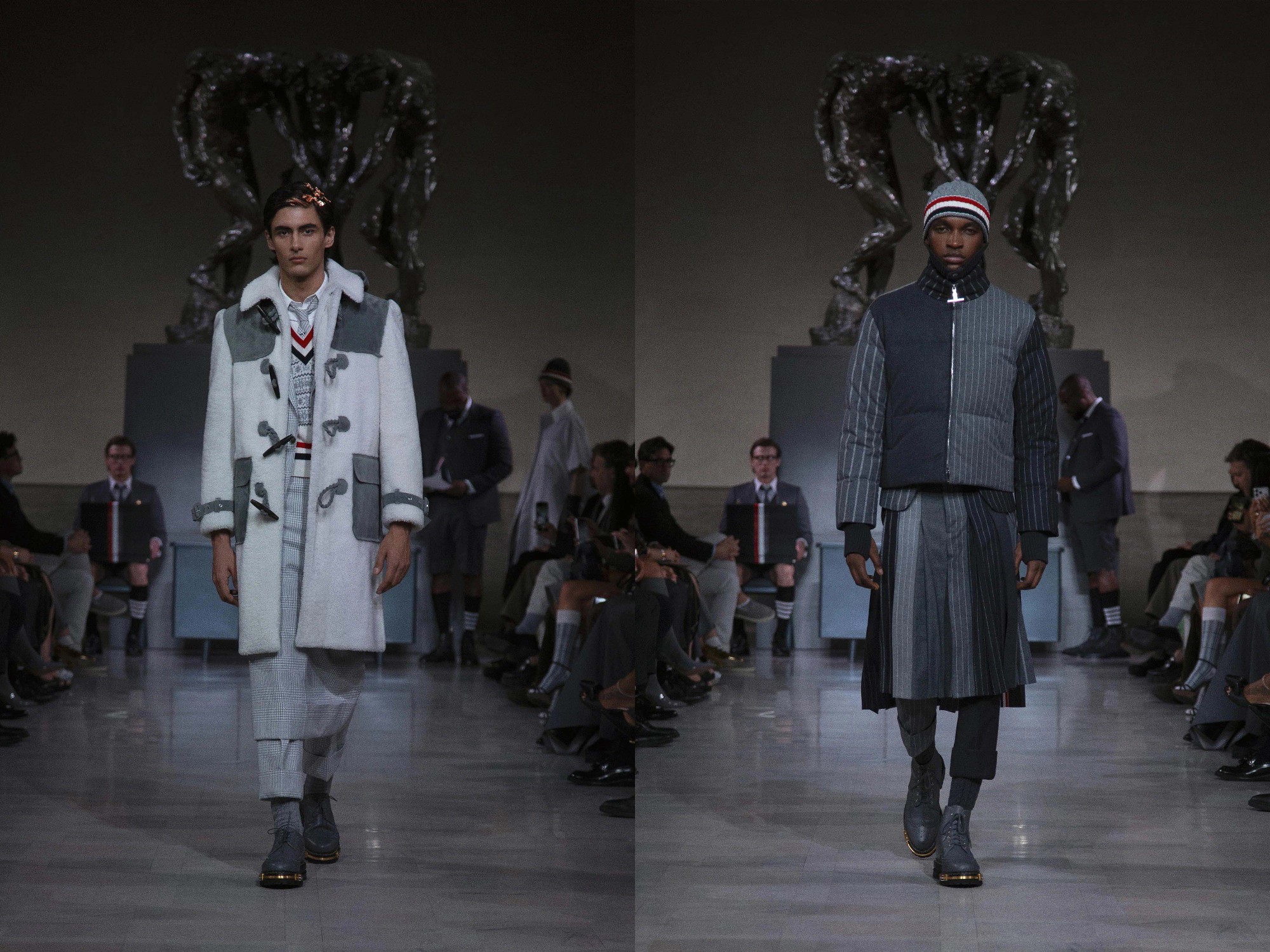 On the eve of Super Bowl LX, Thom Browne returned to the ritual of uniform dressing with a Fall 2026 Ready-to-Wear presentation staged at the neoclassical Legion of Honor Museum. Beneath Auguste Rodin’s monumental bronze The Three Shades, models emerged to a dramatic narration of Inferno delivered by actor Yahya Abdul-Mateen II, a theatrical overture that framed the collection as both procession and performance.