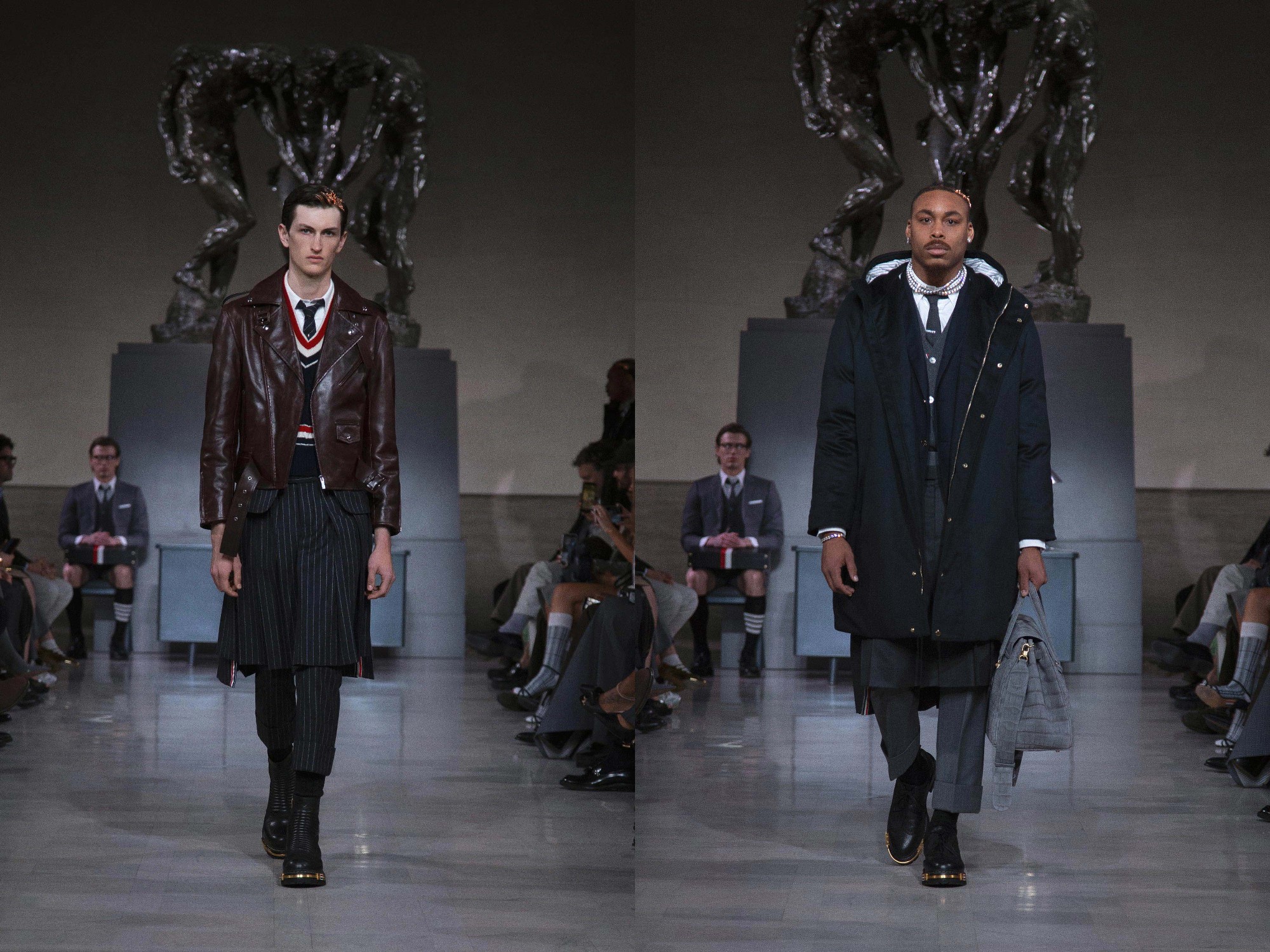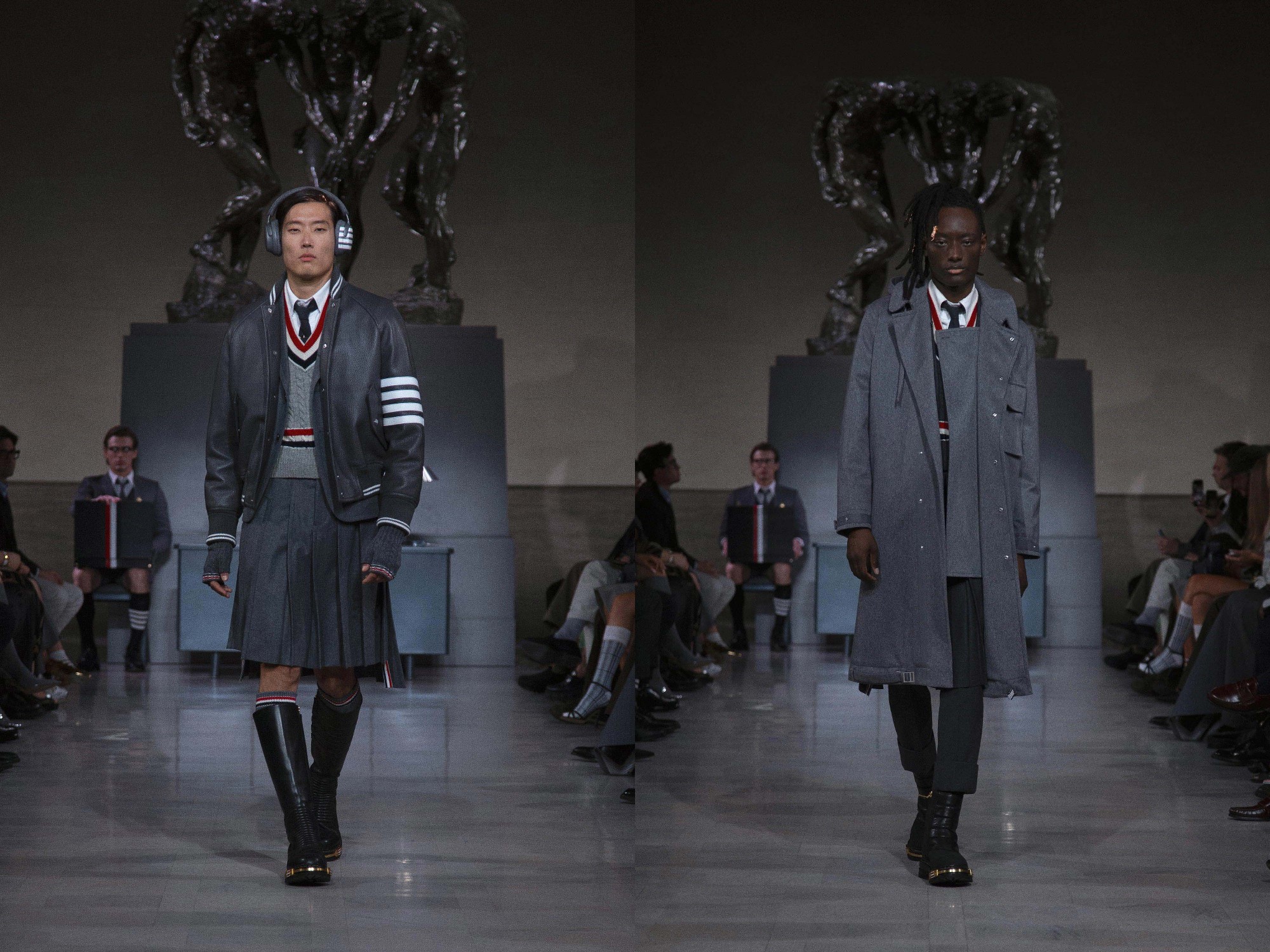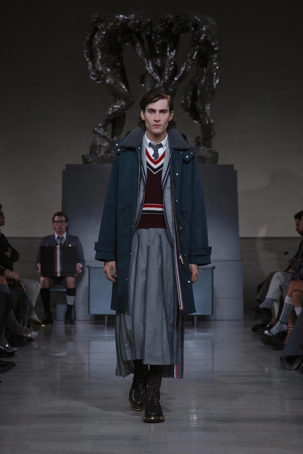 On the eve of Super Bowl LX, Thom Browne returned to the ritual of uniform dressing with a Fall 2026 Ready-to-Wear presentation staged at the neoclassical Legion of Honor Museum. Beneath Auguste Rodin’s monumental bronze The Three Shades, models emerged to a dramatic narration of Inferno delivered by actor Yahya Abdul-Mateen II, a theatrical overture that framed the collection as both procession and performance.