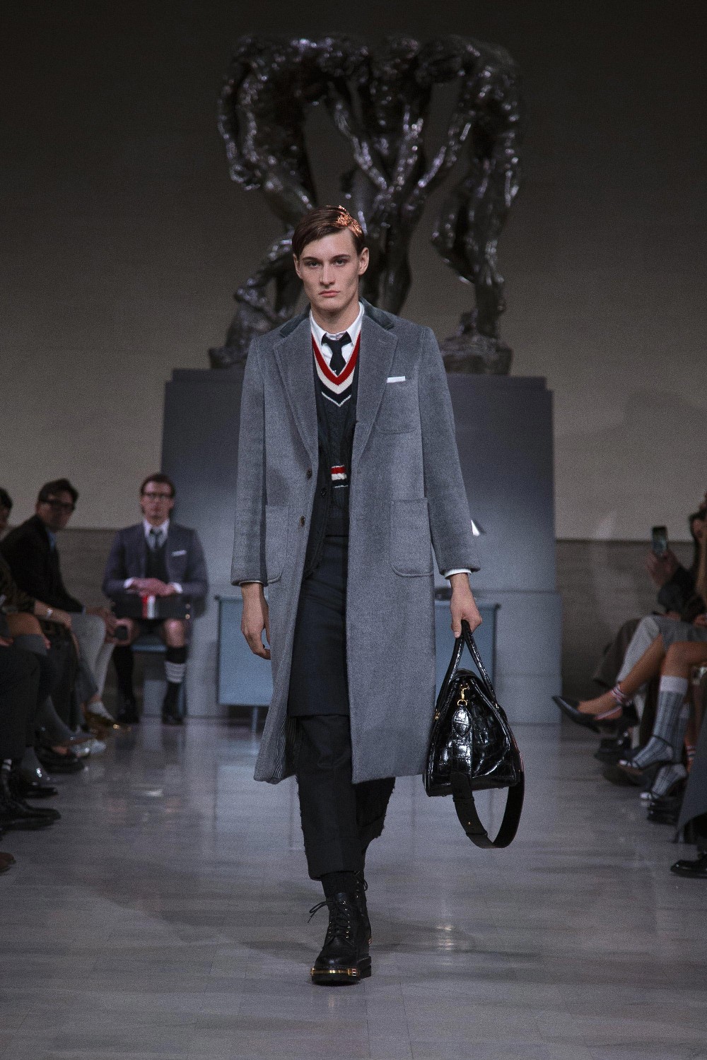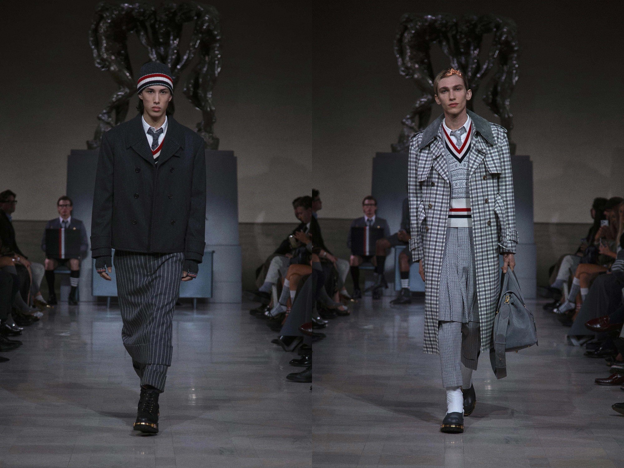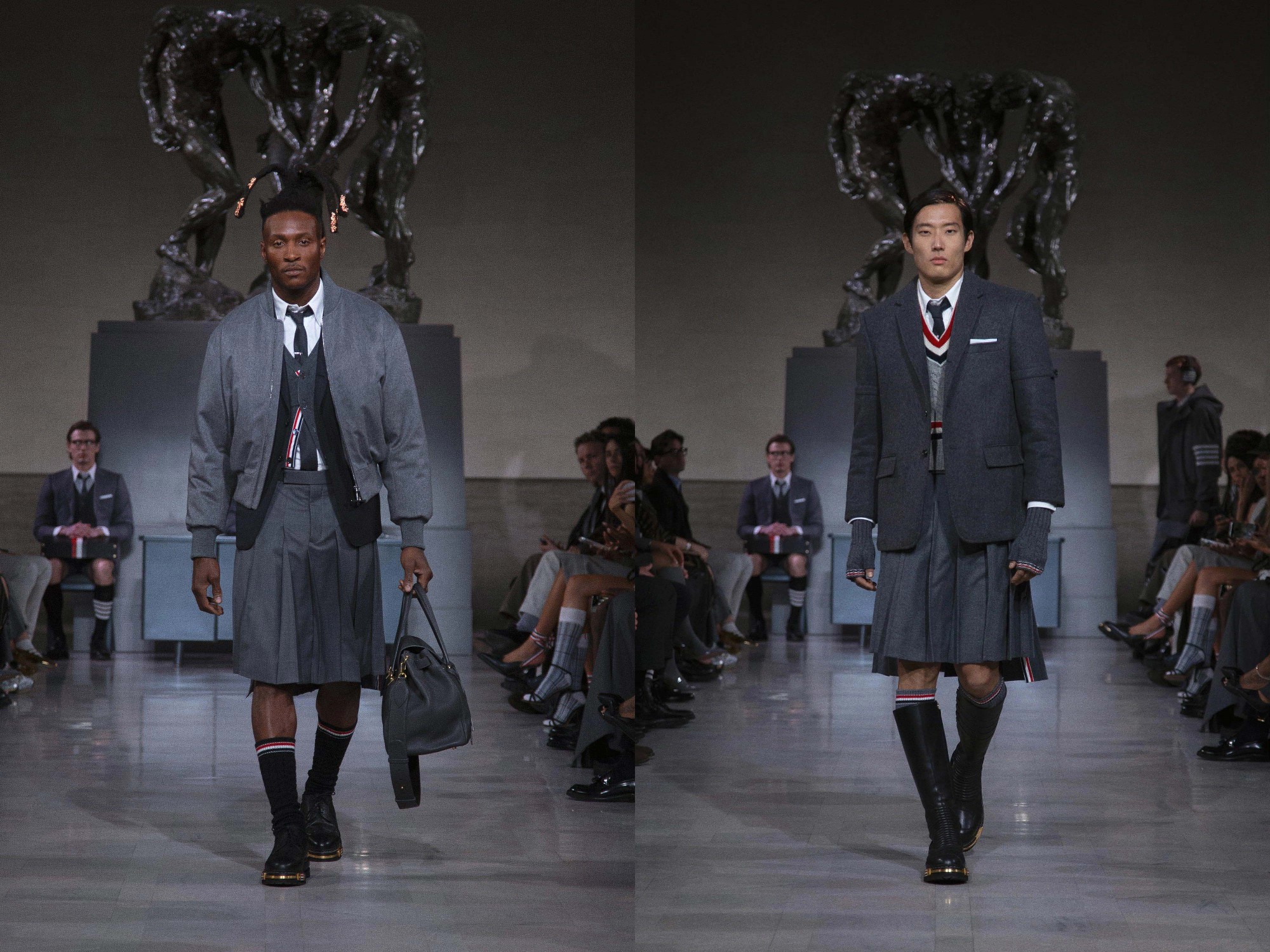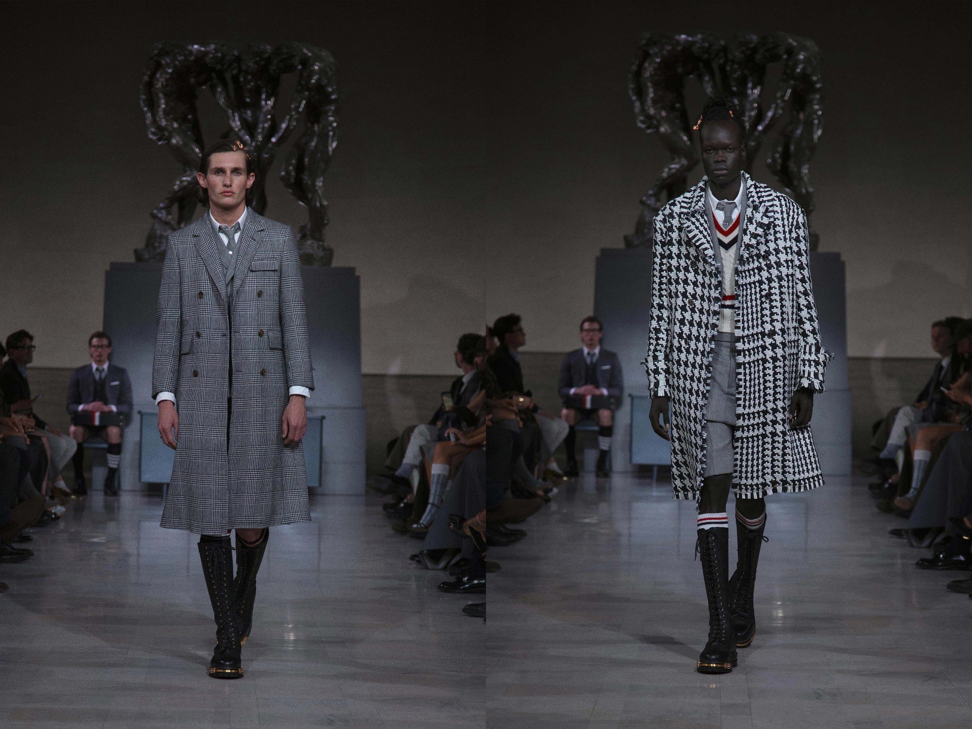 On the eve of Super Bowl LX, Thom Browne returned to the ritual of uniform dressing with a Fall 2026 Ready-to-Wear presentation staged at the neoclassical Legion of Honor Museum. Beneath Auguste Rodin’s monumental bronze The Three Shades, models emerged to a dramatic narration of Inferno delivered by actor Yahya Abdul-Mateen II, a theatrical overture that framed the collection as both procession and performance.