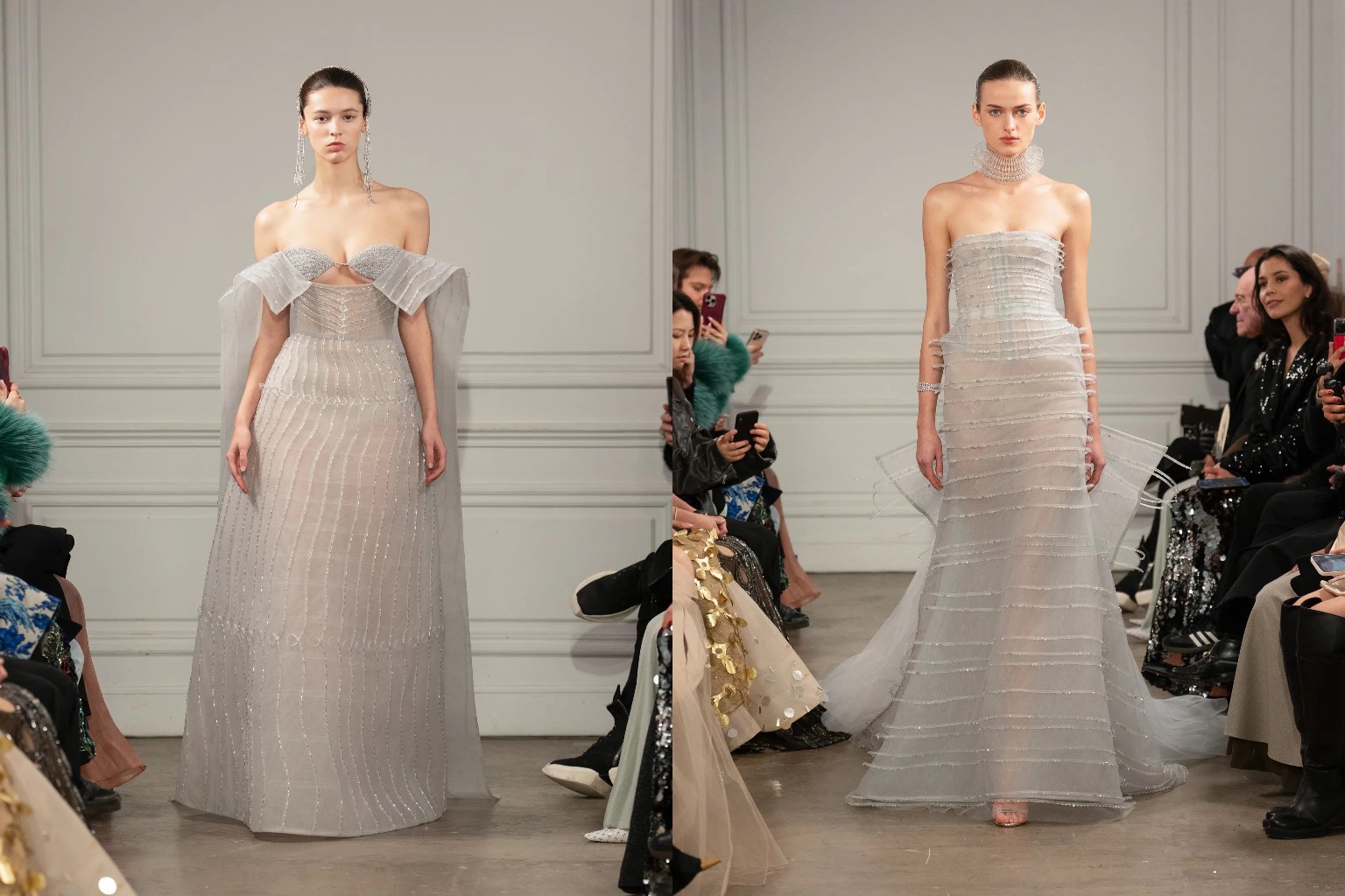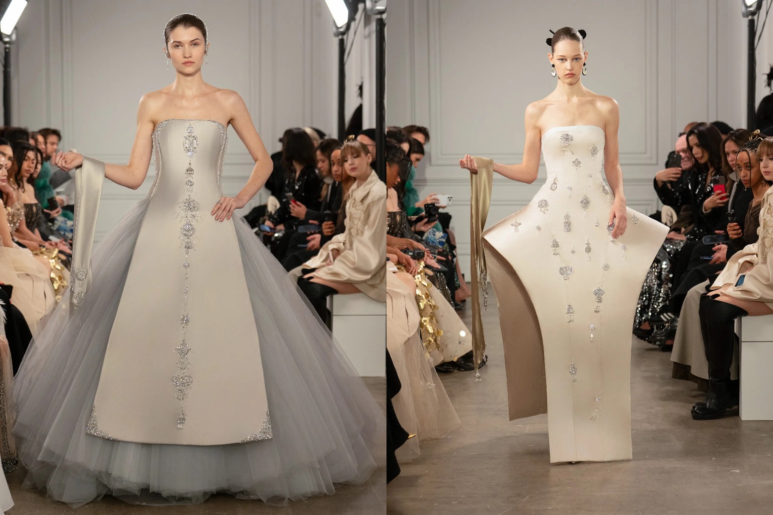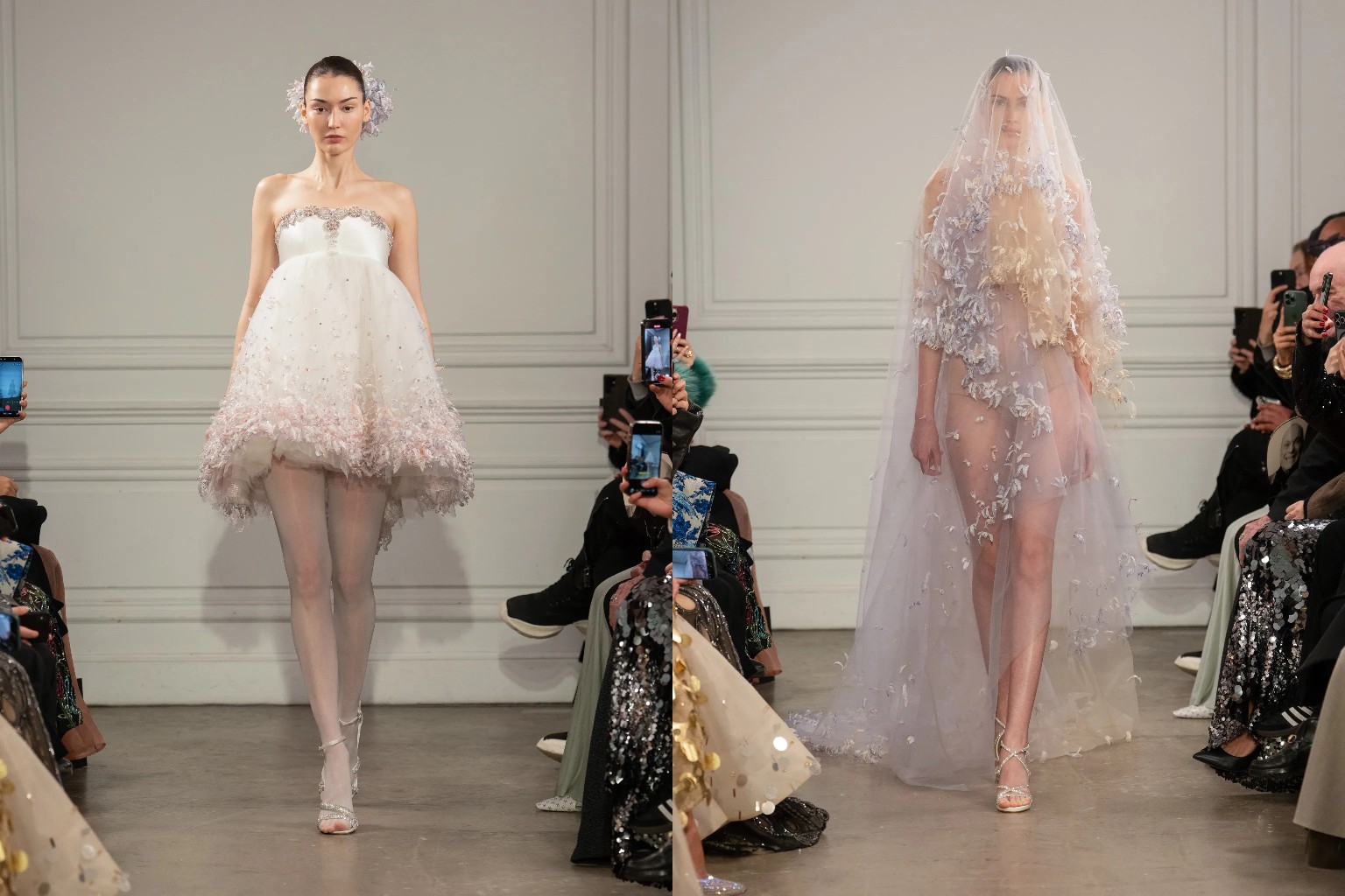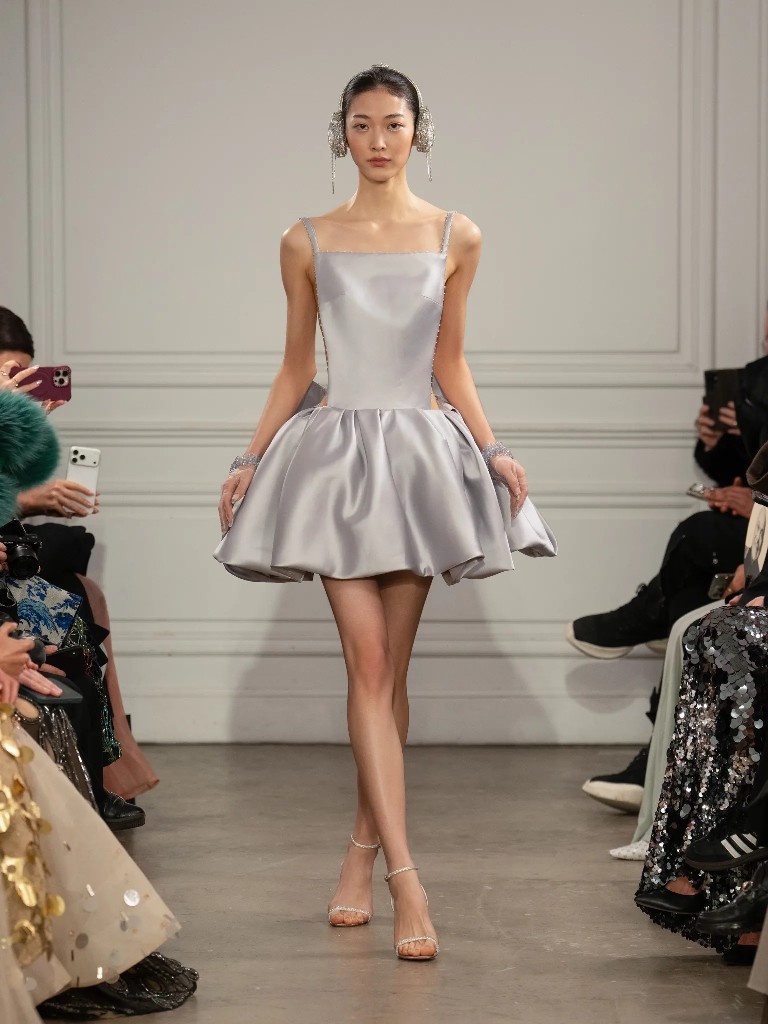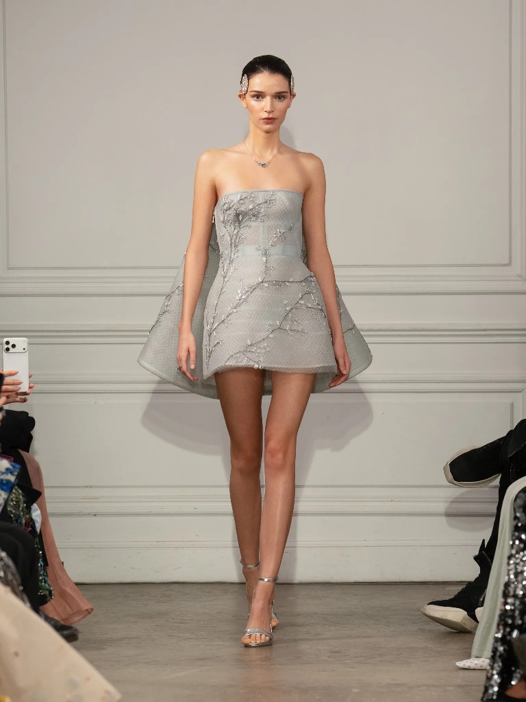 The silhouettes largely adhered to a classically Western couture vocabulary: sculpted corsetry, dramatic volumes, and crinoline-supported skirts. In shorter designs, this structure created playful swing and youthful dynamism. However, in floor-length iterations, the traditional proportions occasionally felt conservative.