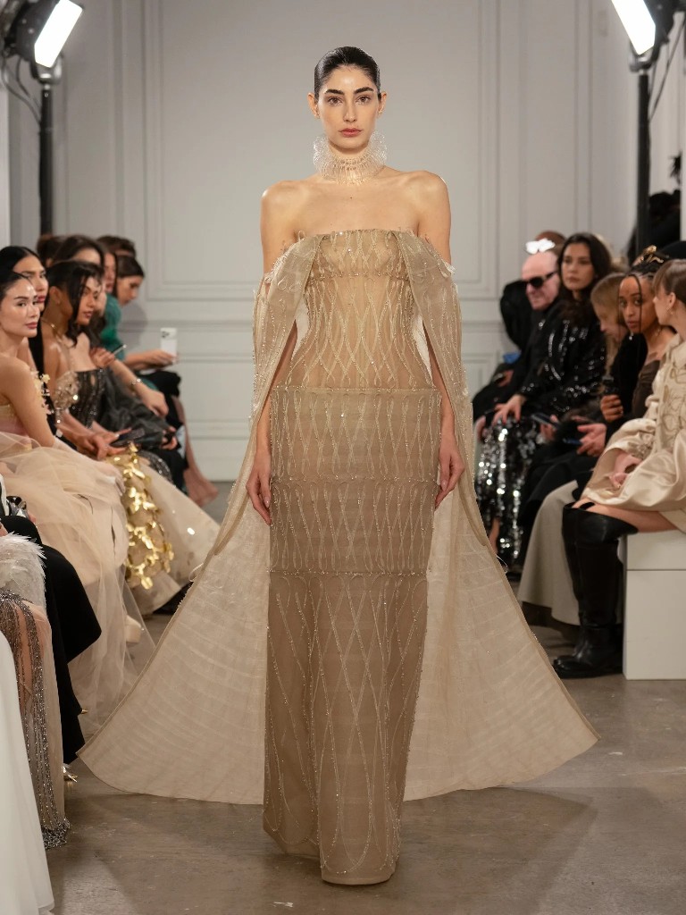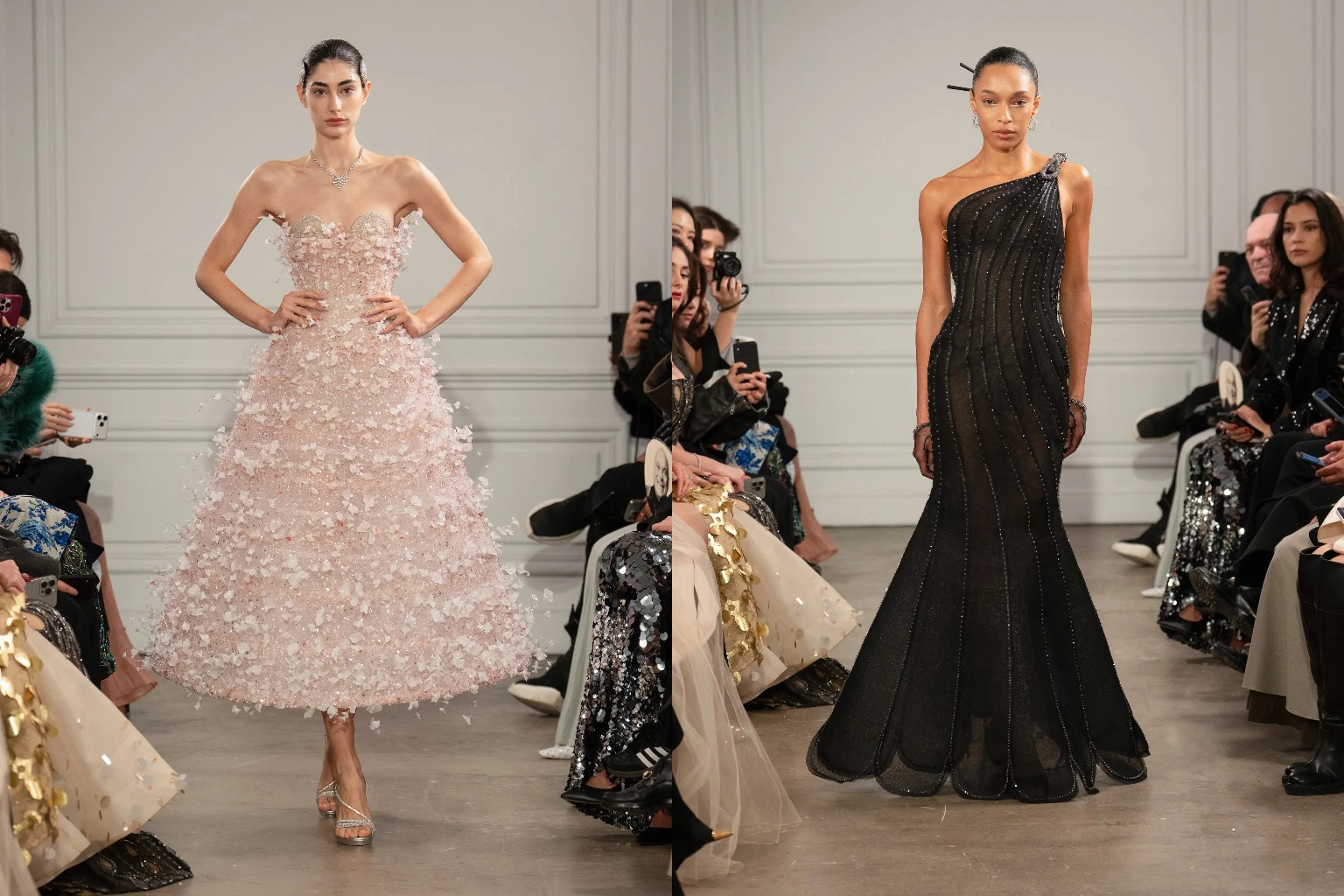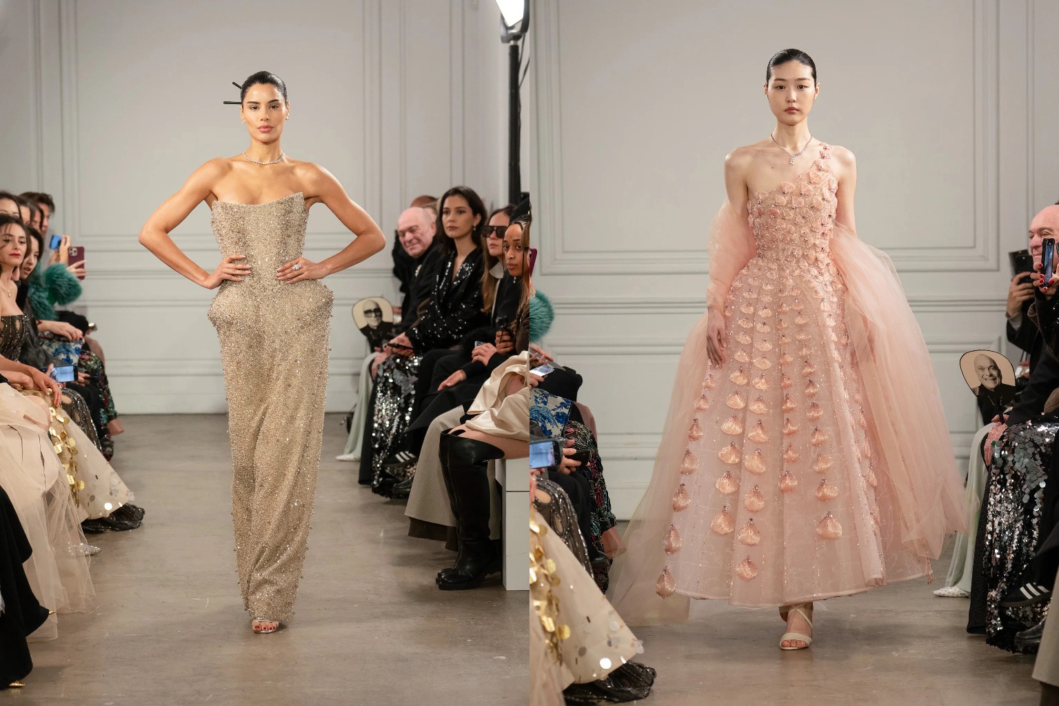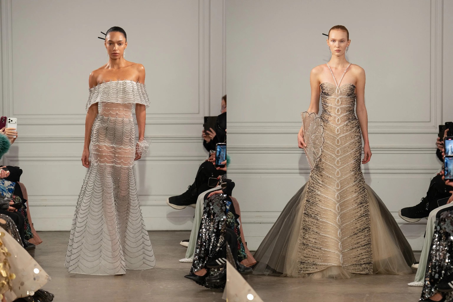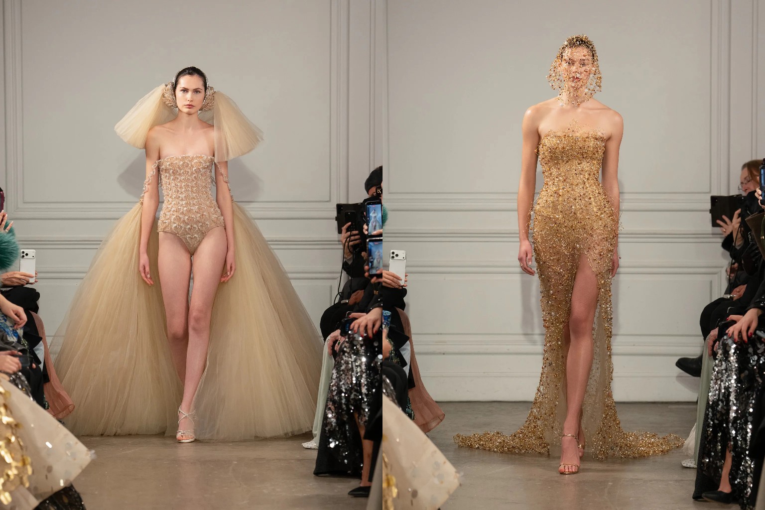 The silhouettes largely adhered to a classically Western couture vocabulary: sculpted corsetry, dramatic volumes, and crinoline-supported skirts. In shorter designs, this structure created playful swing and youthful dynamism. However, in floor-length iterations, the traditional proportions occasionally felt conservative.