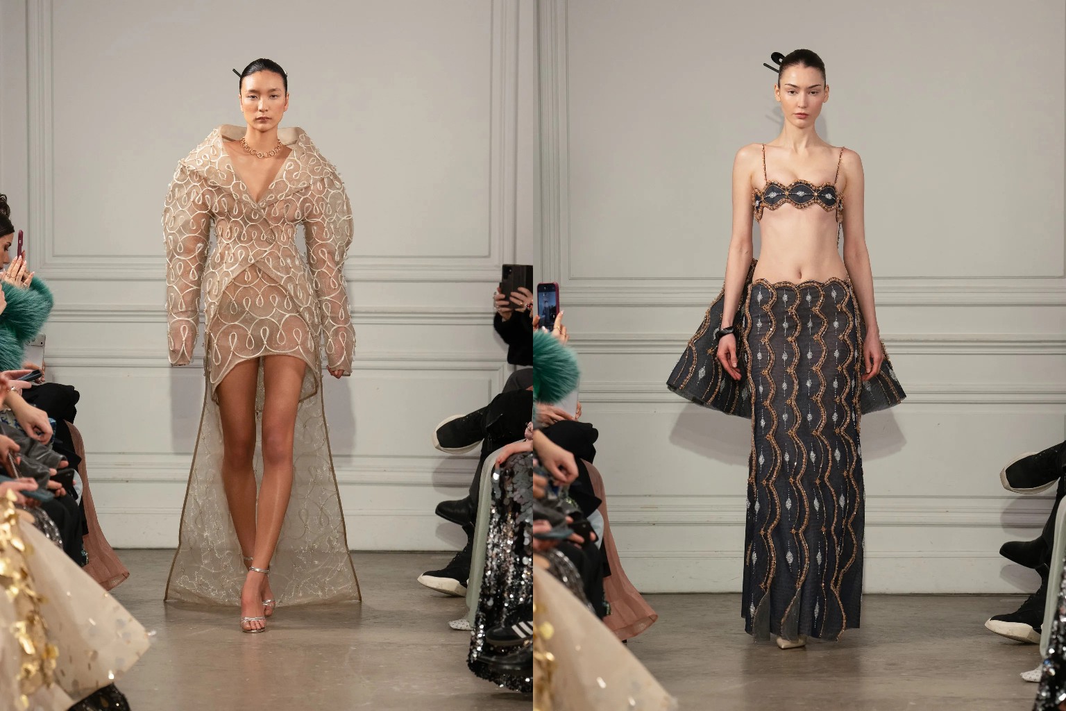 Phan Huy’s debut on the official Paris couture calendar marked a historic double milestone: the youngest invited guest couturier showing under his own name and the first designer from Vietnam to do so. The collection fused Vietnamese craftsmanship with Western couture structure, highlighting meticulous textile innovation, sculptural embroidery, and fluid, embellished silhouettes.