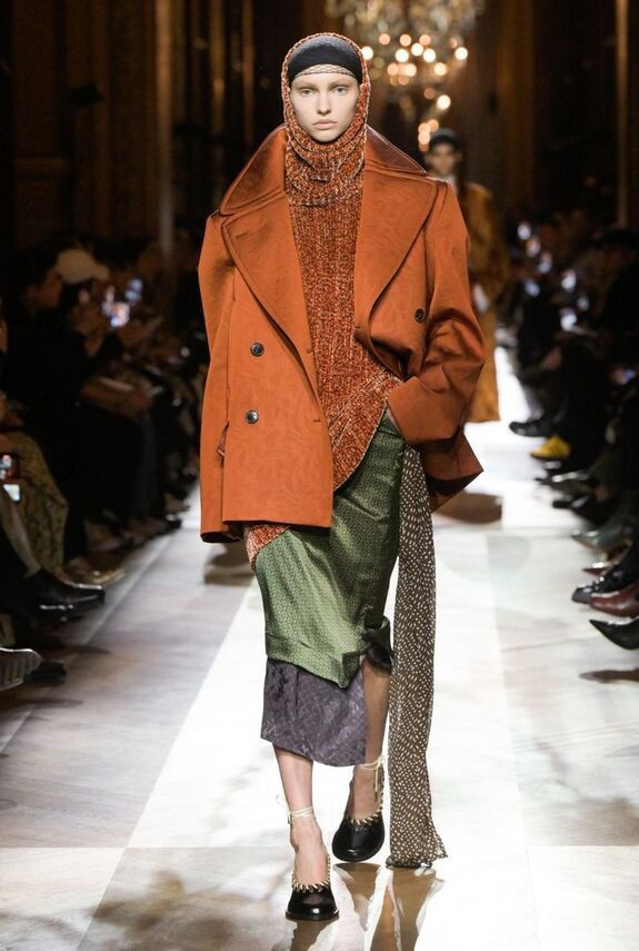 Fall/Winter 2026 collection: poetic and artistic Color Blocking with earthy tones (olive, khaki, navy) combined with warmer shades (burnt orange, brick red). Layering and geometric patterns resulted in a complex, mature, and modern outcome. (Collection Analysis)