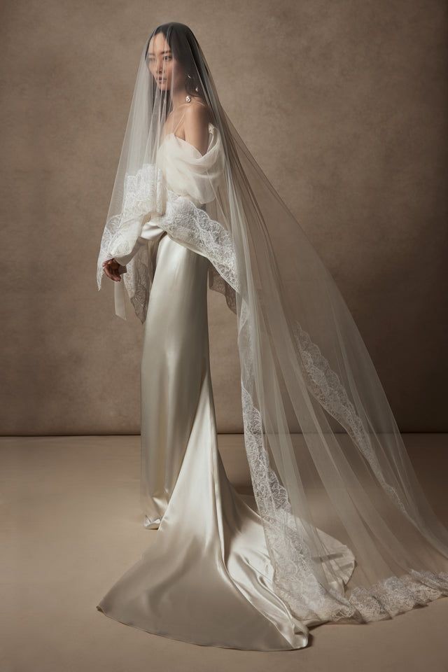 Perfectly suited to mini and tea-length wedding dresses, a blusher veil is a playful way to elevate and diversify your bridal look. This shorter veil offers just a touch of romance and tradition, while letting your modern silhouette, and statement shoes, take the spotlight. It’s an ideal choice for city ceremonies, garden celebrations, and fashion-forward urban elopements.