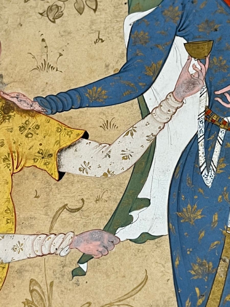 One striking example emerges from an epic illustrating the courtship of the Sassanian prince Khusraw and the Christian princess Shirin. In this painting, Shirin’s attention is immediately captivated by Khusraw’s portrait, so vivid that the scene conveys romance at first glance. Four women in the composition display patterned hands, suggesting henna markings. Since practical use of tambourines or serving dishes would be hindered by wet paste, these depictions are best understood as stylized stains, visually preserving the essence of henna artistry rather than literal application.