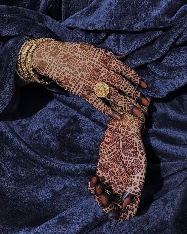 Historical records reveal that Persian henna artists, known as negarin, mastered a range of stain colors, from warm reddish-brown to nearly black, applying techniques that enhanced the hue: thick paste, wrapping, pomegranate juice, and citron were used to deepen the color. While blackened patterns were often depicted in Safavid-era paintings, they may have represented aesthetic ideals rather than the literal color of the skin, reflecting the cultural canon of beauty alongside delicate feet, clear skin, and small, smiling mouths.