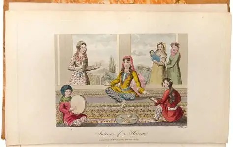 By the early 19th century, travelers and artists alike documented Persian women’s henna practices with remarkable precision. In 1815, Malcom noted that brides stained their hands with henna the day before their wedding, a ritual corroborated by Tancoigne, who wrote, “The Persian ladies … stain their nails, the palms of their hands and the soles of their feet with an orange color …” Henna in daily practice was often maintained as a uniform, glove-like stain, rather than elaborate patterns, since decorative designs could peak in color only two to three days after application and fade quickly. For women in harems, consistently presentable, though unadorned, hands were preferable to beautifully patterned hands that would soon lose their vibrancy.